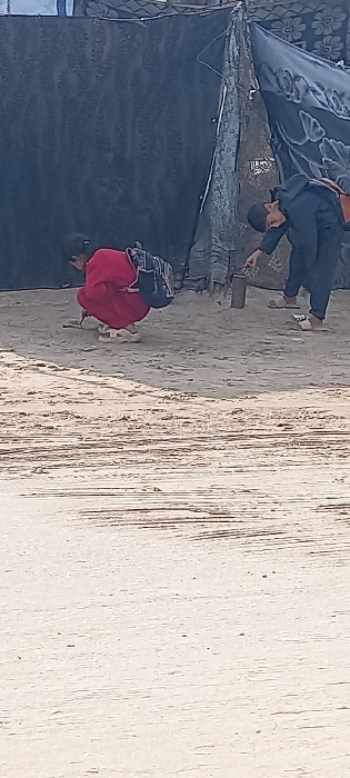 The scene depicts two individuals on sandy, uneven ground in Khan Yunis, Palestinian Territory, against a backdrop of makeshift structures. A person, identified as a child or young individual, is squa…read more