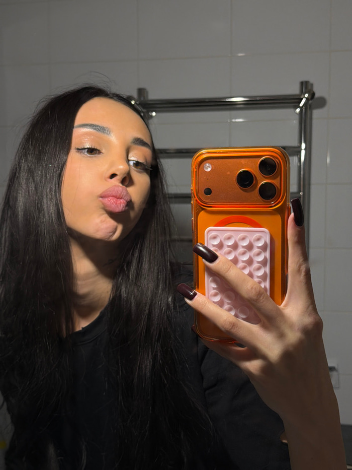 A woman poses in a selfie, holding an orange phone with a pink bubble grid. Her dark hair is styled long, and her lips are pursed. She wears a black top. The background appears to be a bathroom with w…read more