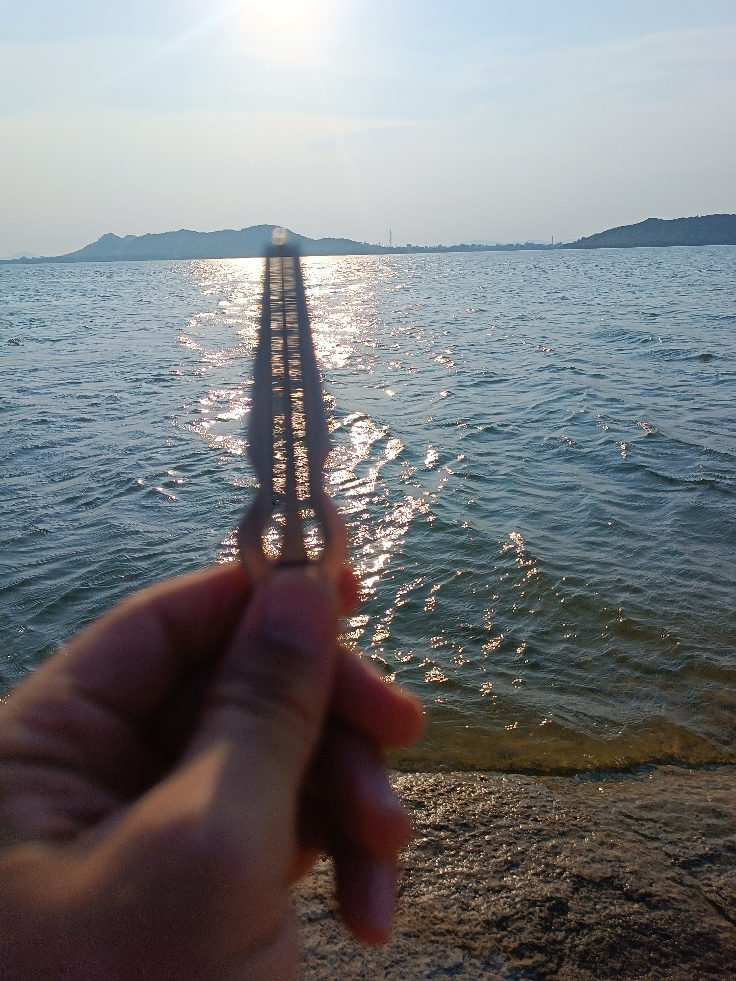 A handheld mouth harp is held up to the light of the sun in front of a body of water with a shoreline. In the distance are low-lying hills and an industrial structure. The location is Kammavaripalli,…read more