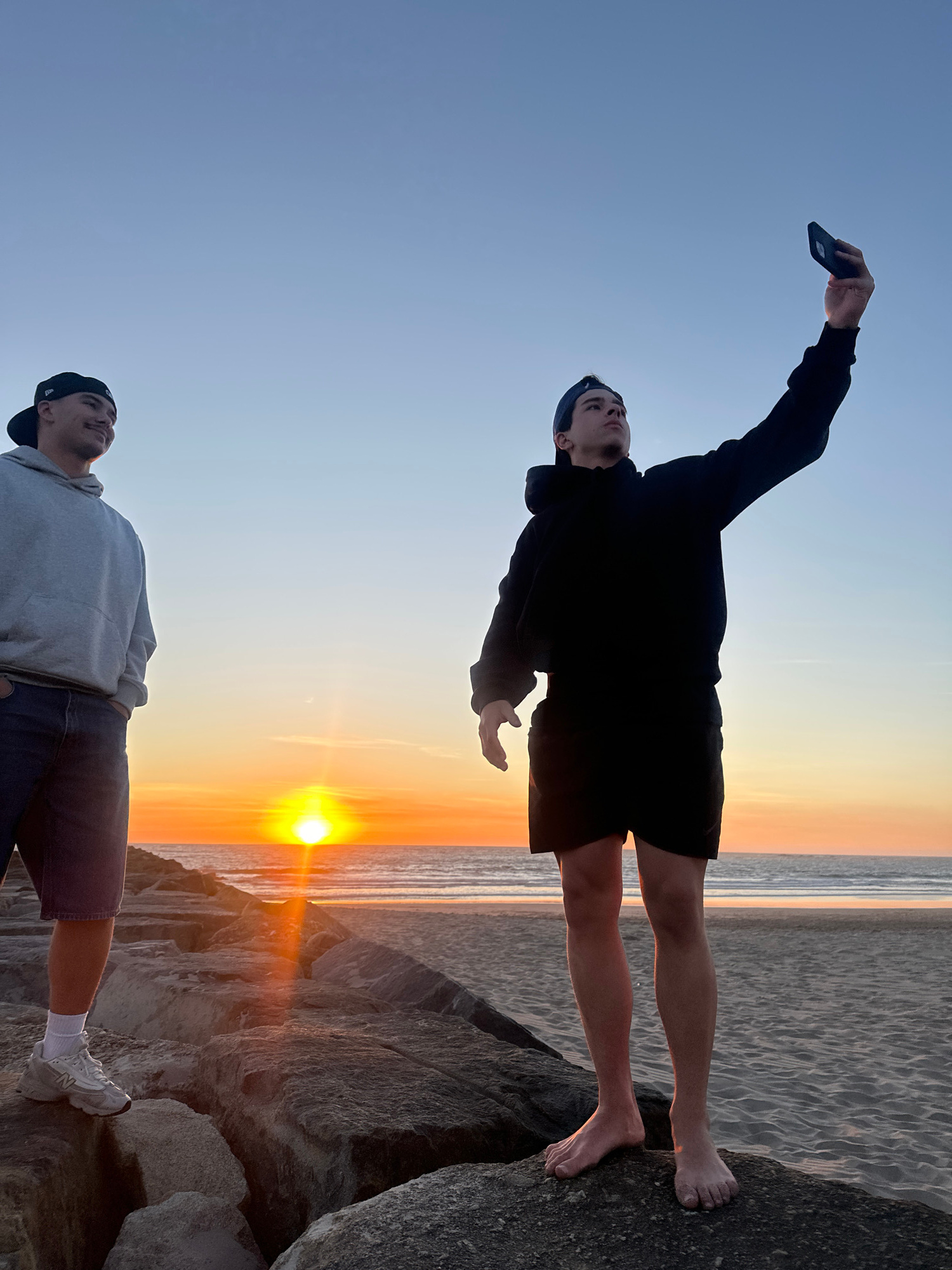 A photograph captures two people at a beach in Esposende, Portugal during a sunset. The image is oriented with the beach to the right. The person in the upper part of the frame, facing upwards, is dr…read more