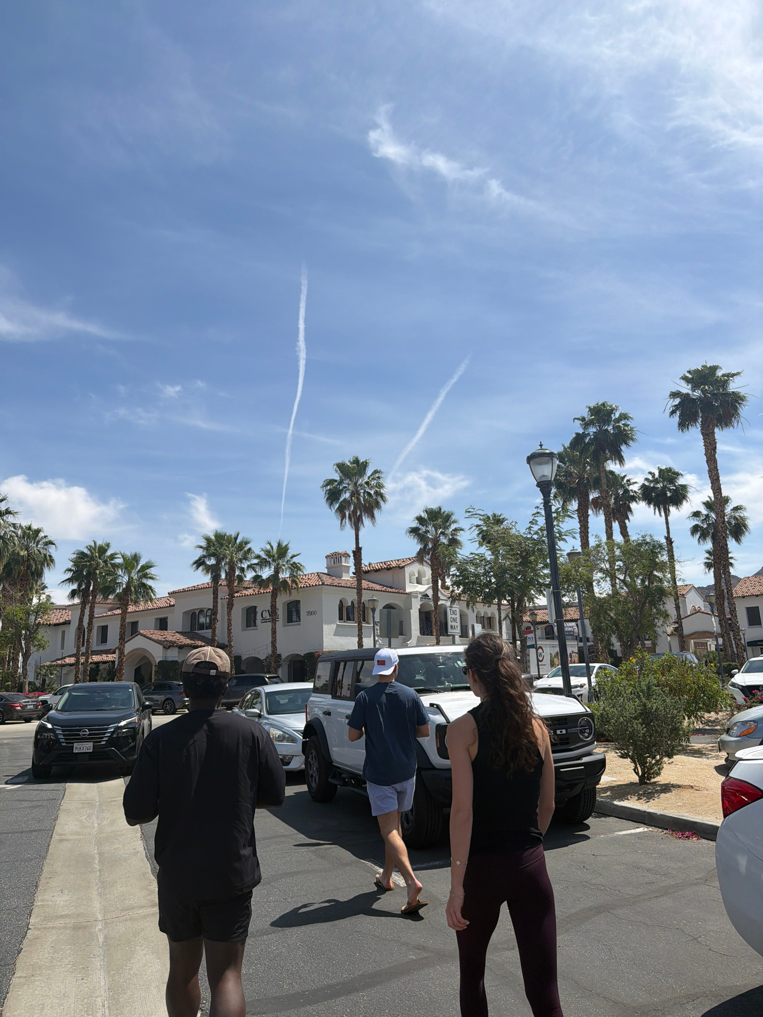 Here's a description of the scene in the image: **Location:** La Quinta, California, United States of America. **Scene:** A street scene with rows of tall palm trees lining buildings with white wall…read more