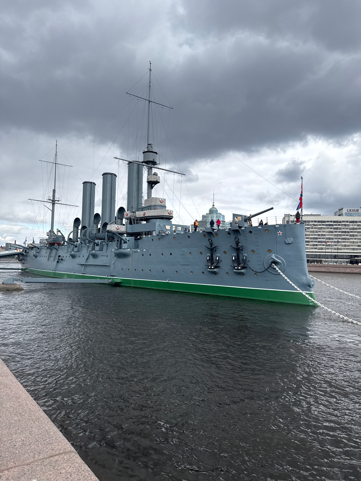The image shows the Cruiser Aurora, a retired Russian warship and museum ship, docked in the Neva River in Saint Petersburg, Russia. The ship is painted in gray with a green waterline stripe. It has m…read more