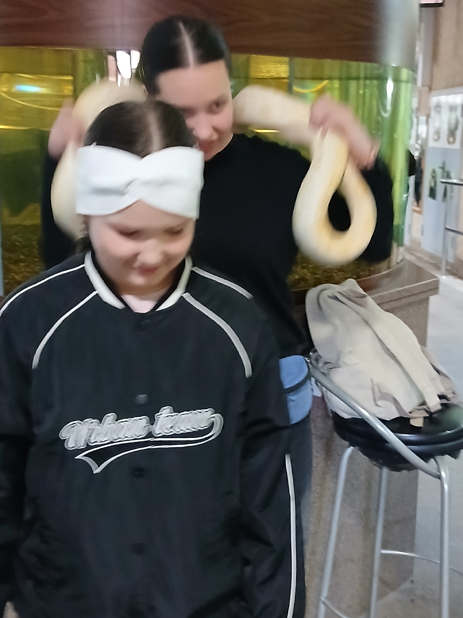 Two girls pose with a snake in front of a large aquarium. The younger girl wears a white bow in her hair and a black jacket with white trim and lettering. An adult holds a cream-colored snake around t…read more