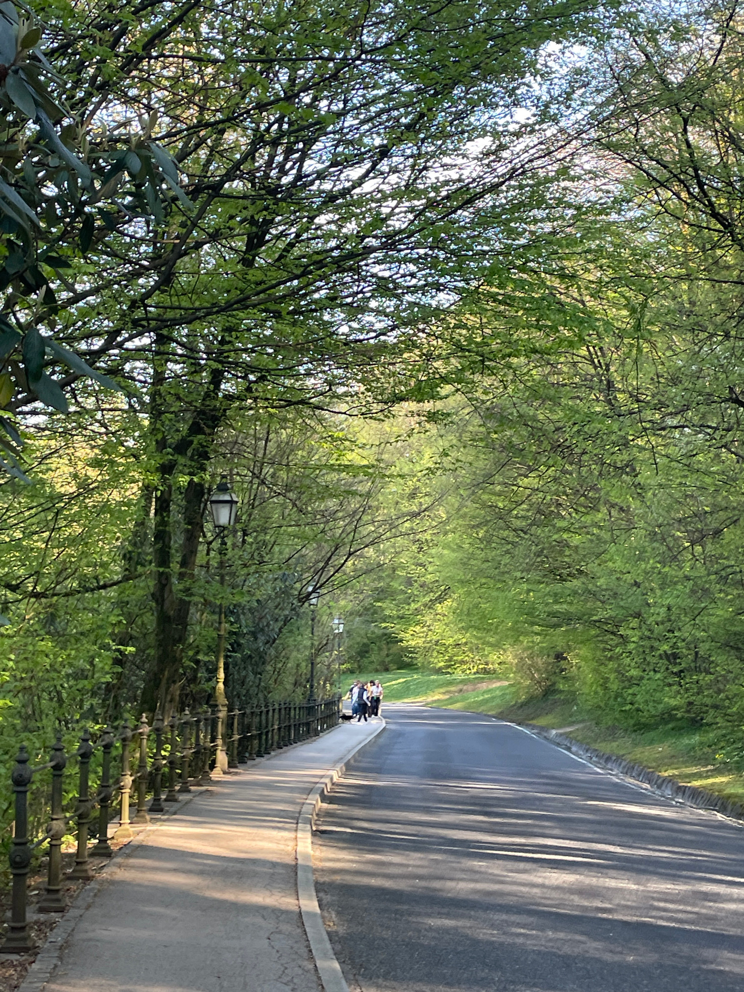 The image depicts a tree-lined road with a sidewalk, typical of a park in Ljubljana, Slovenia. The trees have fresh green leaves, indicating springtime. Sunlight filters through the leaves, creating sā¦read more