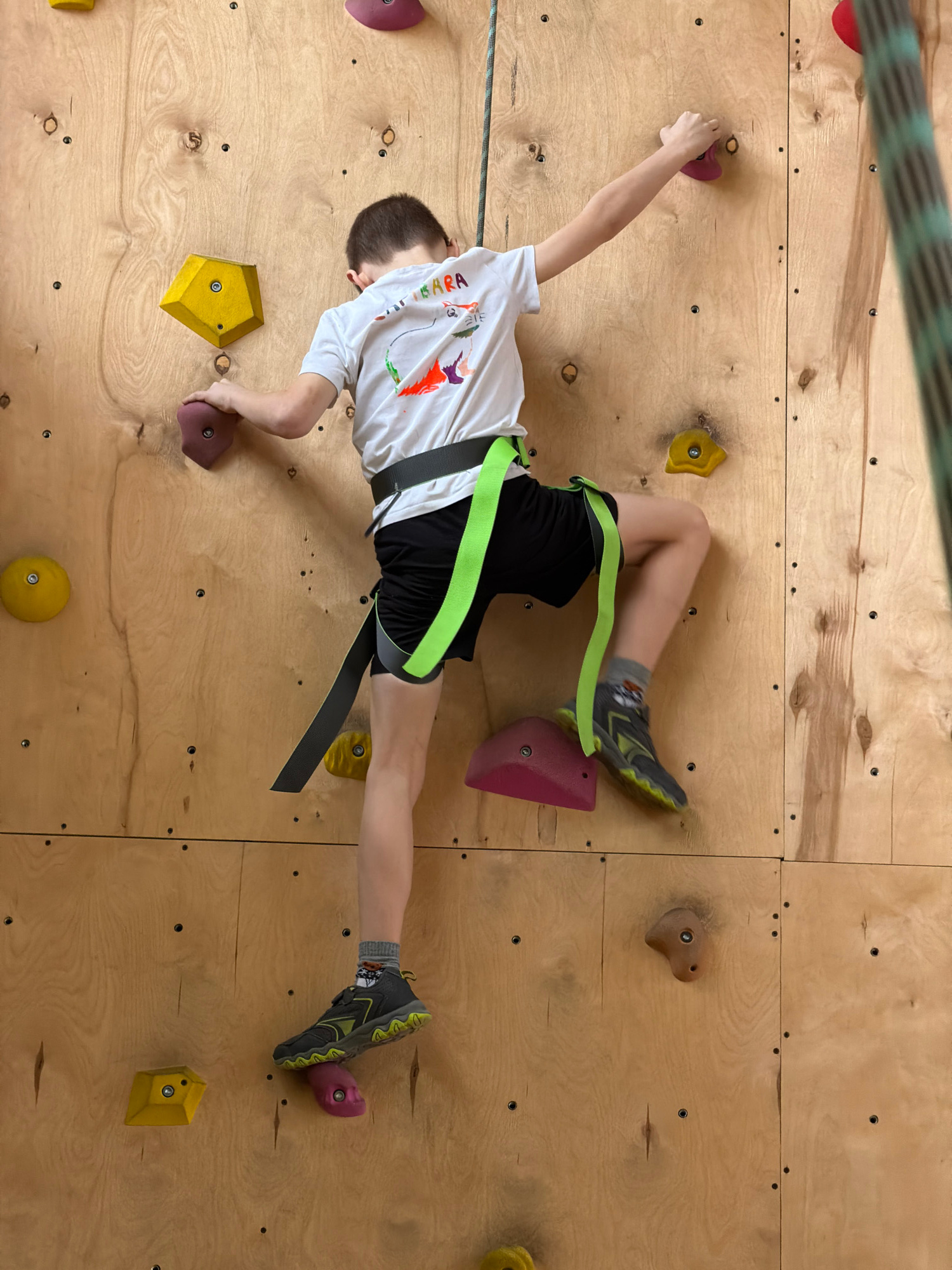 A young child, presumably male, is depicted actively climbing an indoor wooden climbing wall in Izhevsk, Russia. The child is positioned horizontally across the wall, gripping various colorful holds.…read more