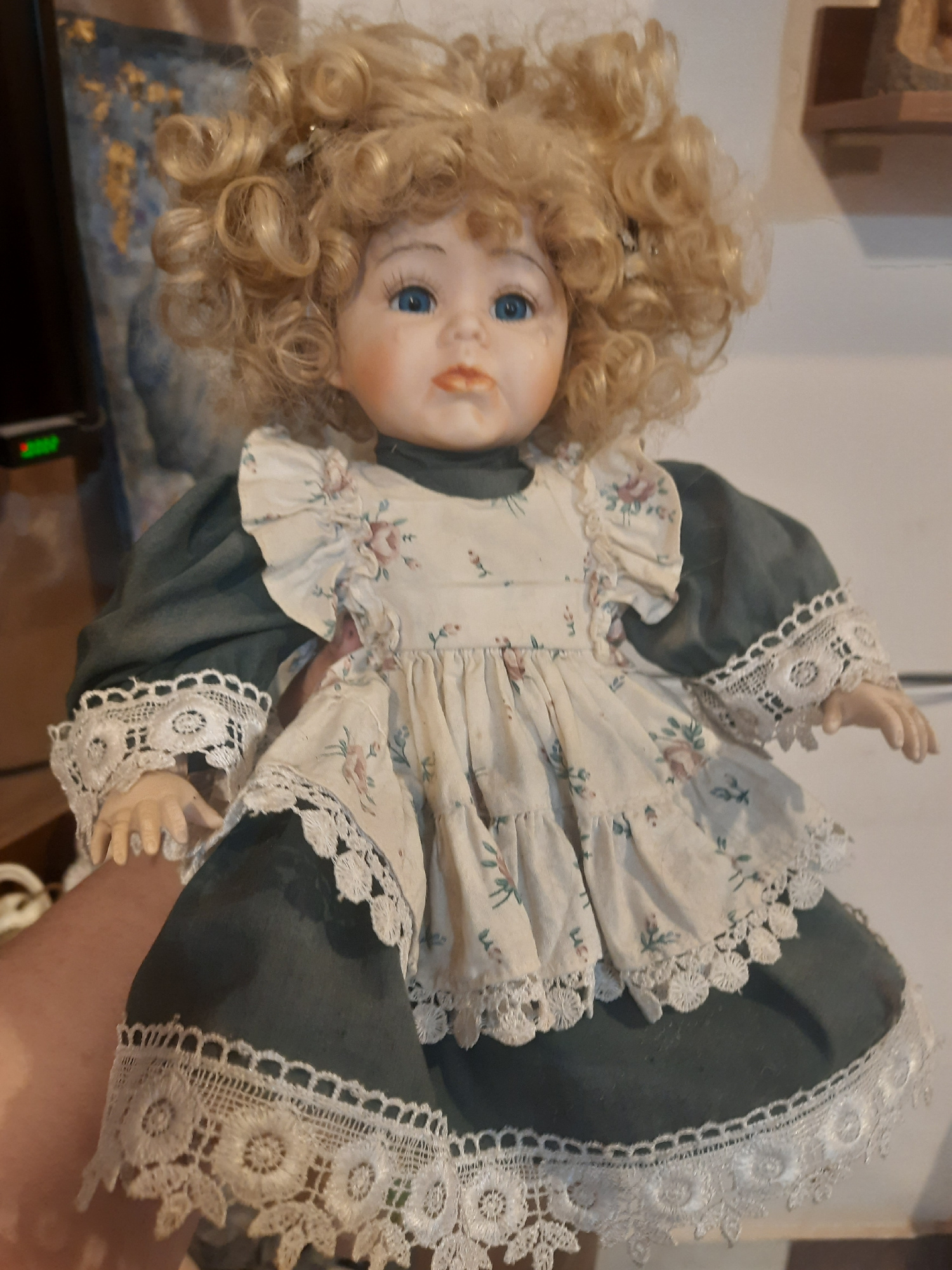 A porcelain doll with blonde, curly hair and blue eyes is lying on a surface in Al Hadaba, Egypt. The doll is wearing a long, green dress trimmed with white lace, and a white floral-patterned bodice w…read more