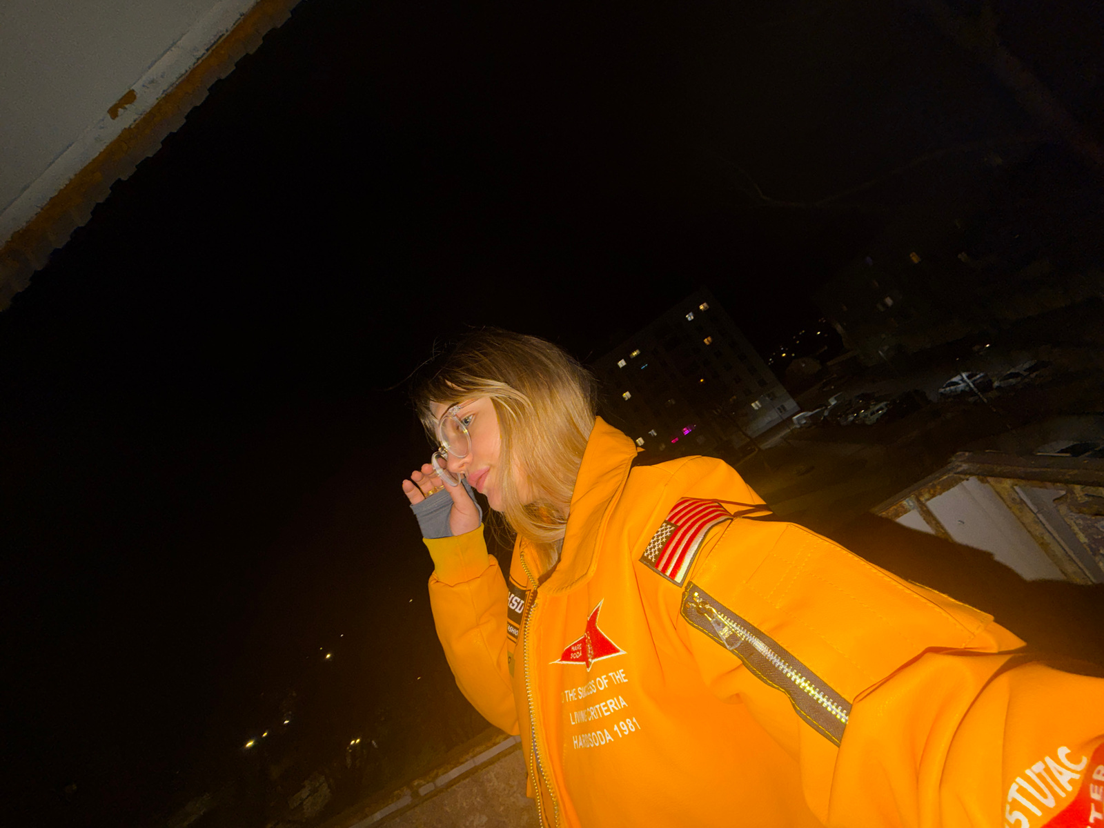A woman stands outdoors at night, illuminated by an unseen light source. She wears glasses and a yellow jacket with American flag patches and text including "THE SHOES OF THE LIVING CRITERIA" and "HAN…read more