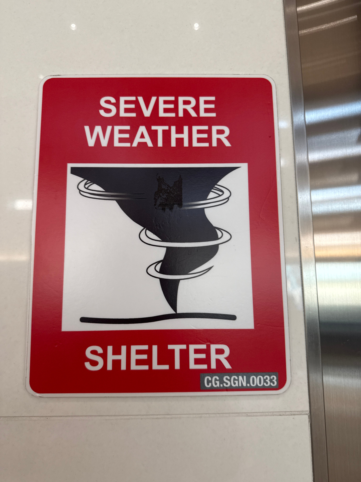 A "Severe Weather Shelter" sign is affixed to a white tiled surface, presumably on the floor of an indoor space. The sign is rectangular with rounded corners and features a white tornado graphic on a…read more