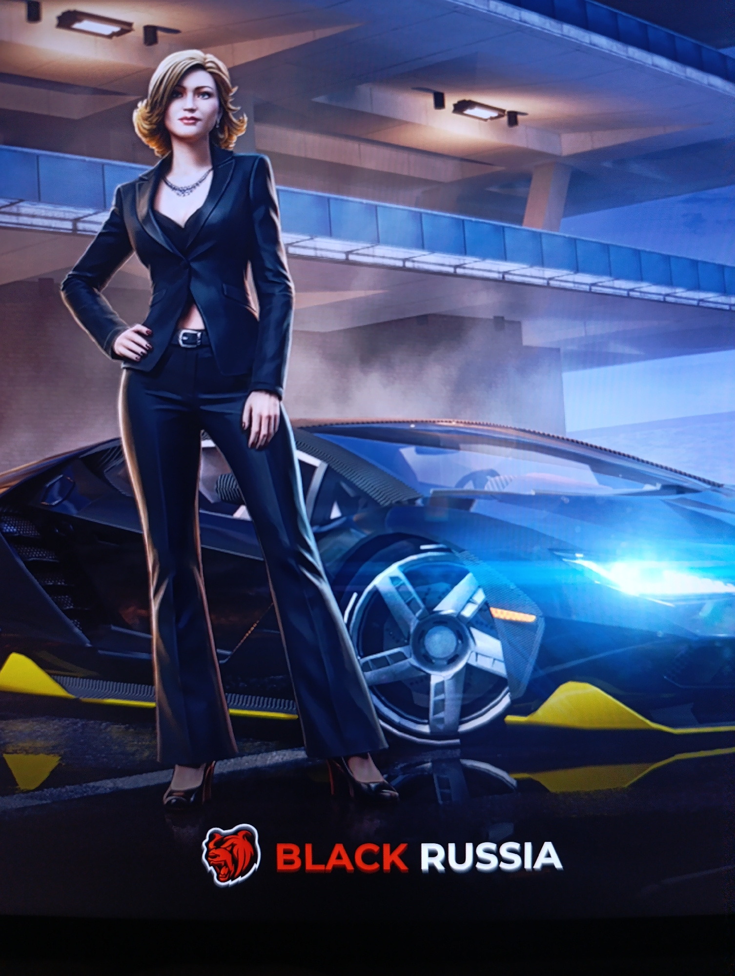 A color image shows a woman standing in front of a car with the words “BLACK RUSSIA” at the bottom. The woman has blonde hair and is wearing a black pantsuit and high heels. She is standing with her h…read more