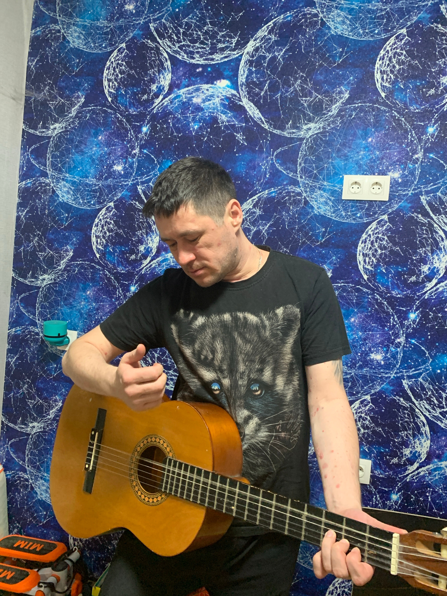 A person is playing a guitar in front of a blue patterned wall. The person is wearing a black t-shirt with a wolf design. The guitar is brown and appears to be a classical guitar. The background wall…read more