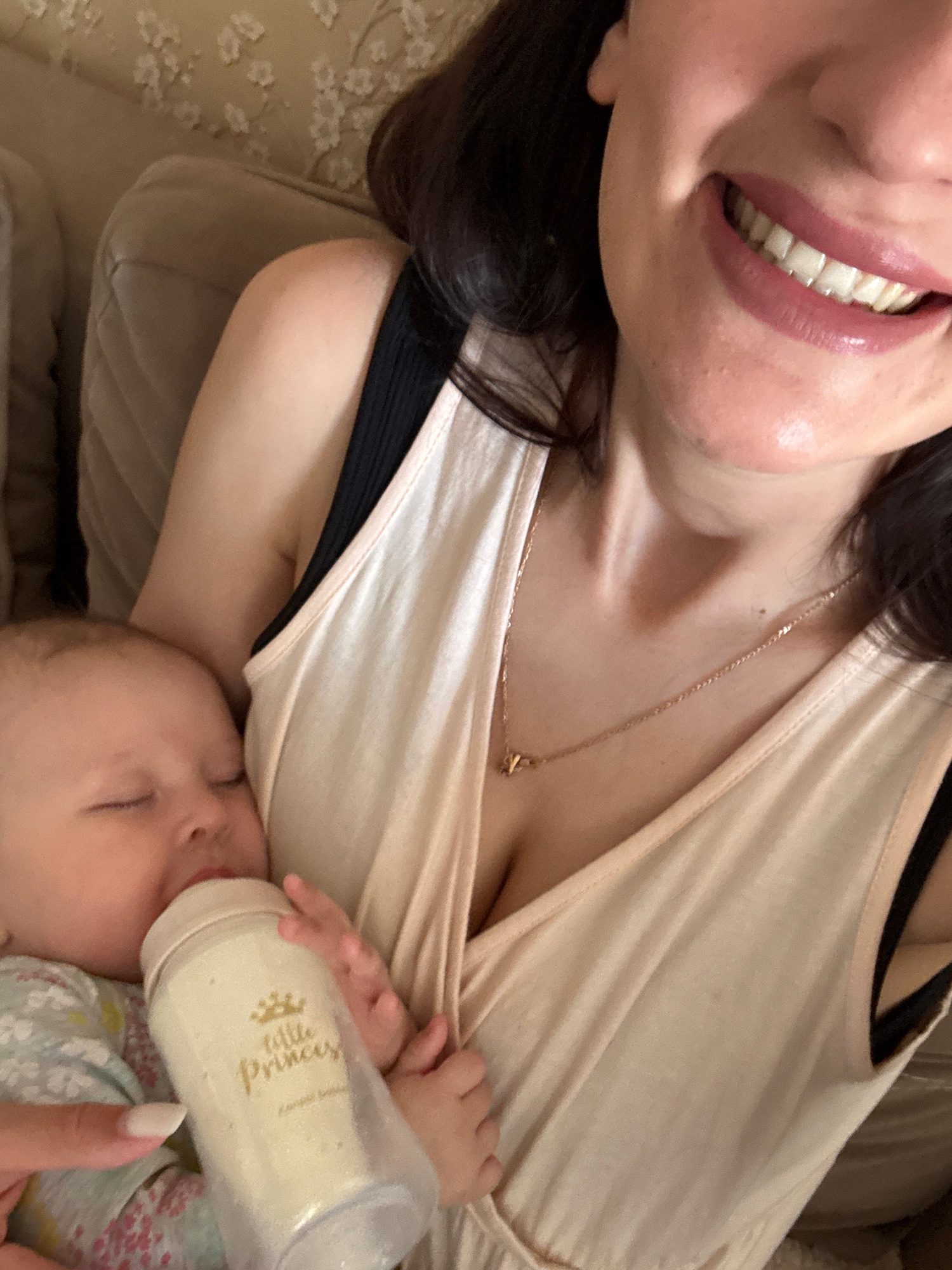 A woman lies on a soft surface, possibly a couch or bed, and smiles while holding a baby who drinks from a bottle labeled "Little Princess." The woman has dark hair and wears a beige top with a black…read more