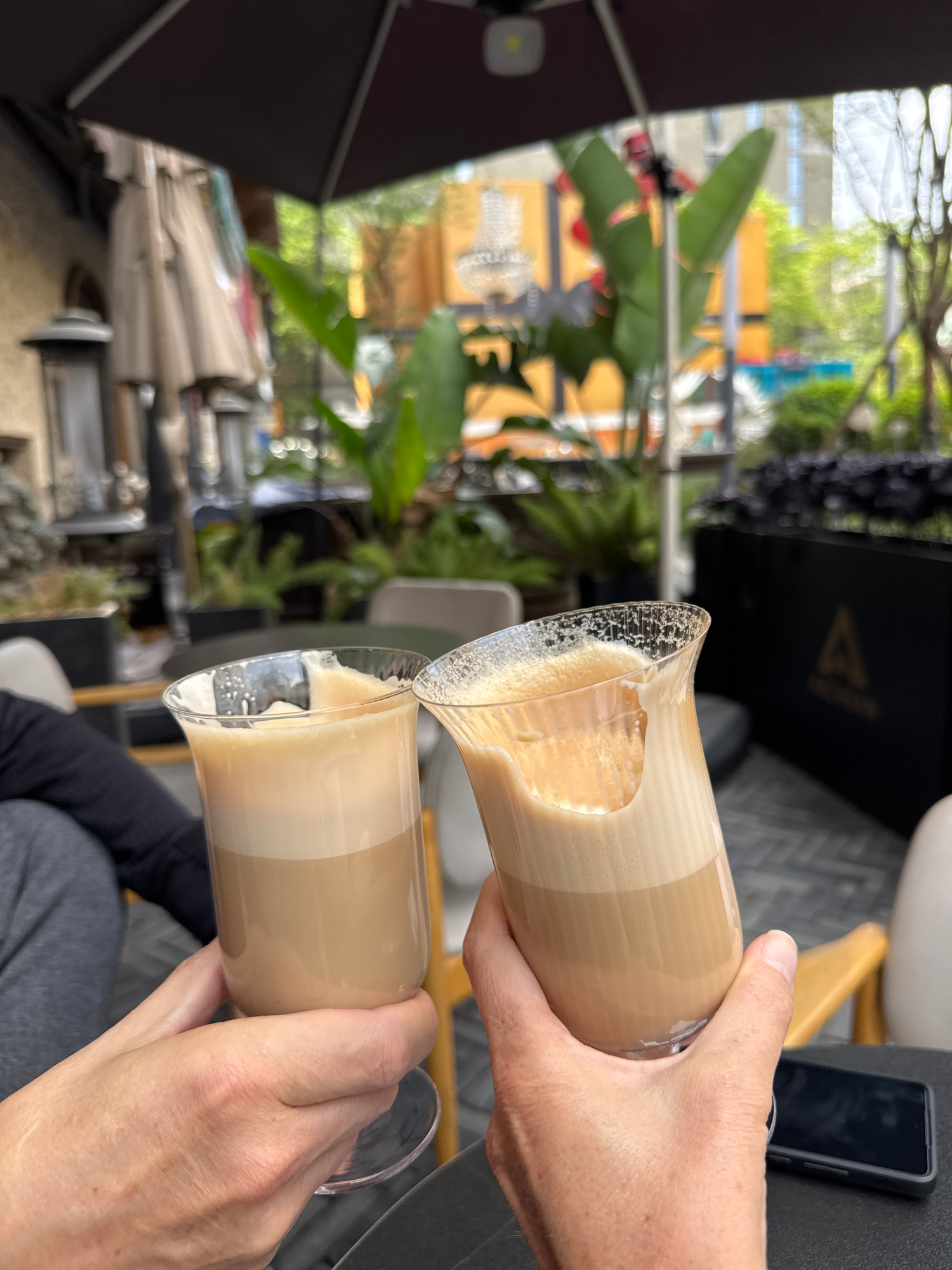 The image shows two hands clinking glasses of layered coffee drinks, likely lattes, in an outdoor cafe setting. The background features greenery, buildings, and an umbrella, suggesting an urban enviro…read more