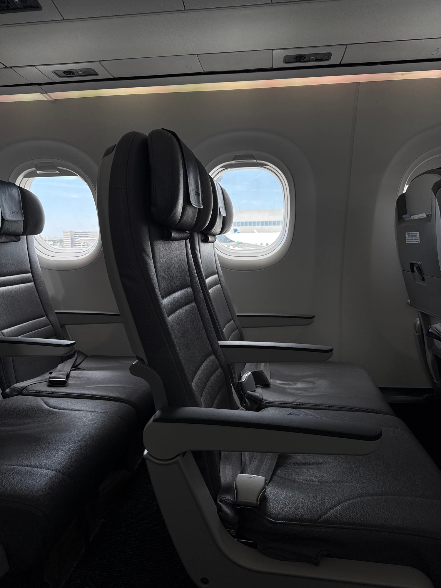 The image captures the interior of an airplane cabin, oriented on its side. Multiple rows of empty, dark grey or black leather seats with seatbelts are visible. The seatbelt buckle in the foreground cā¦read more