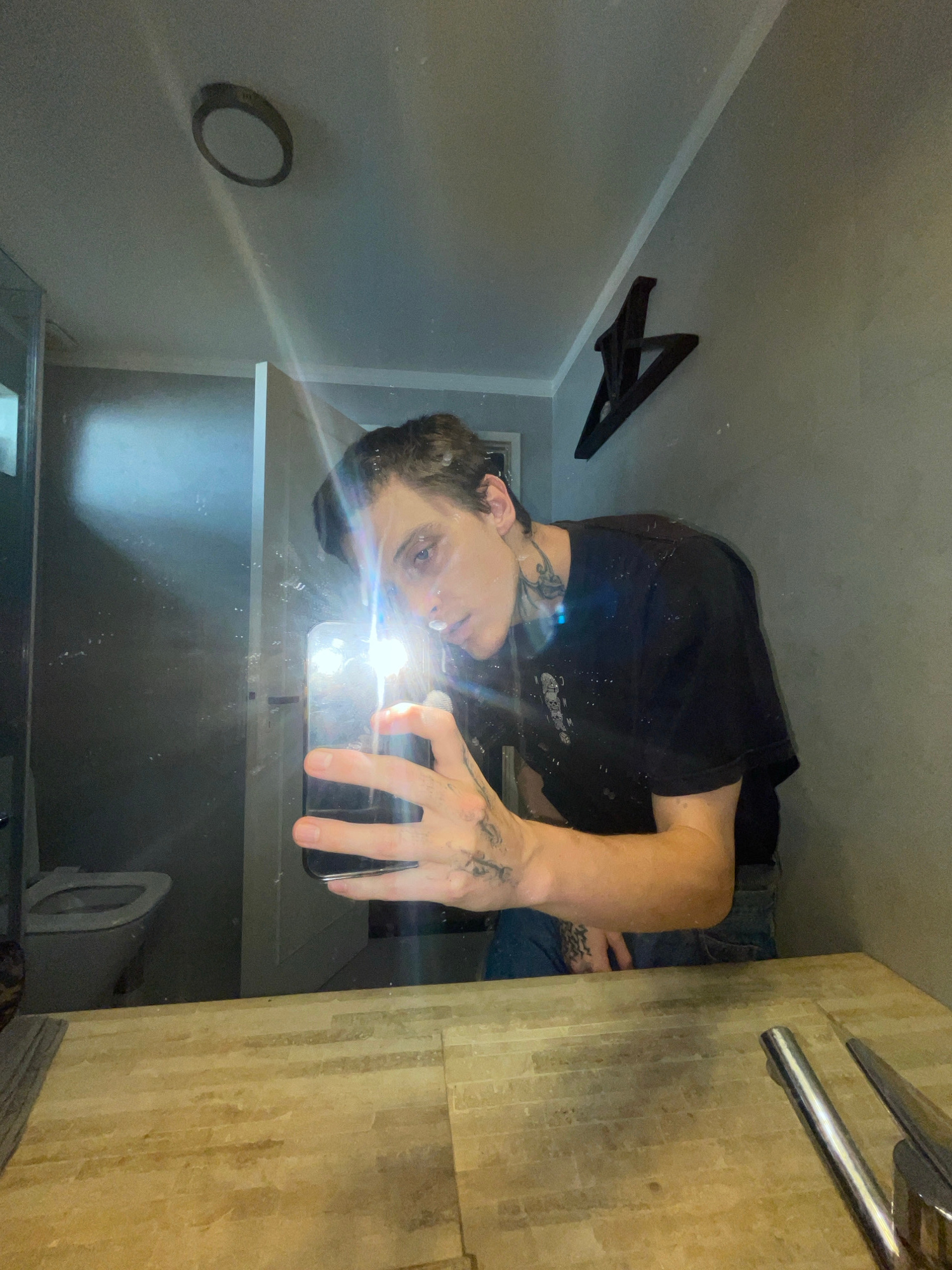 A person is taking a mirrored selfie in what appears to be a bathroom. The person is wearing a black t-shirt and jeans, and has tattoos on their arms and hands. The bathroom has a white sink and cabin…read more