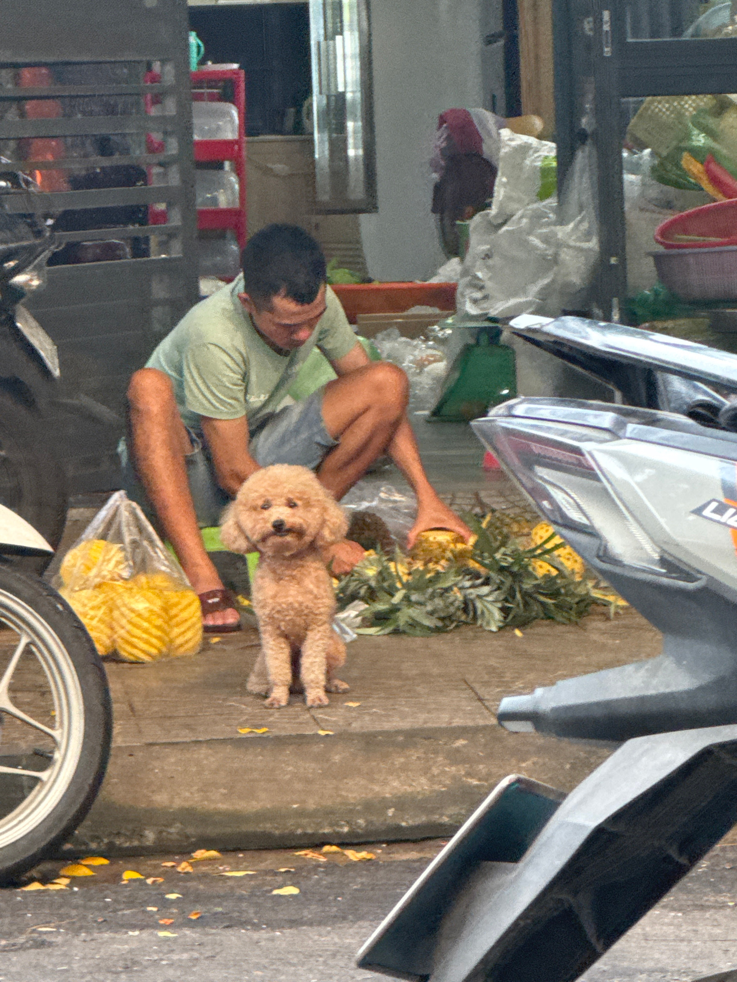 The image captures a scene on a street in the city of Đà Nẵng, Vietnam. A man sits cross-legged on the sidewalk, peeling pineapples. A small, tan-colored poodle sits nearby, looking towards the camera…read more