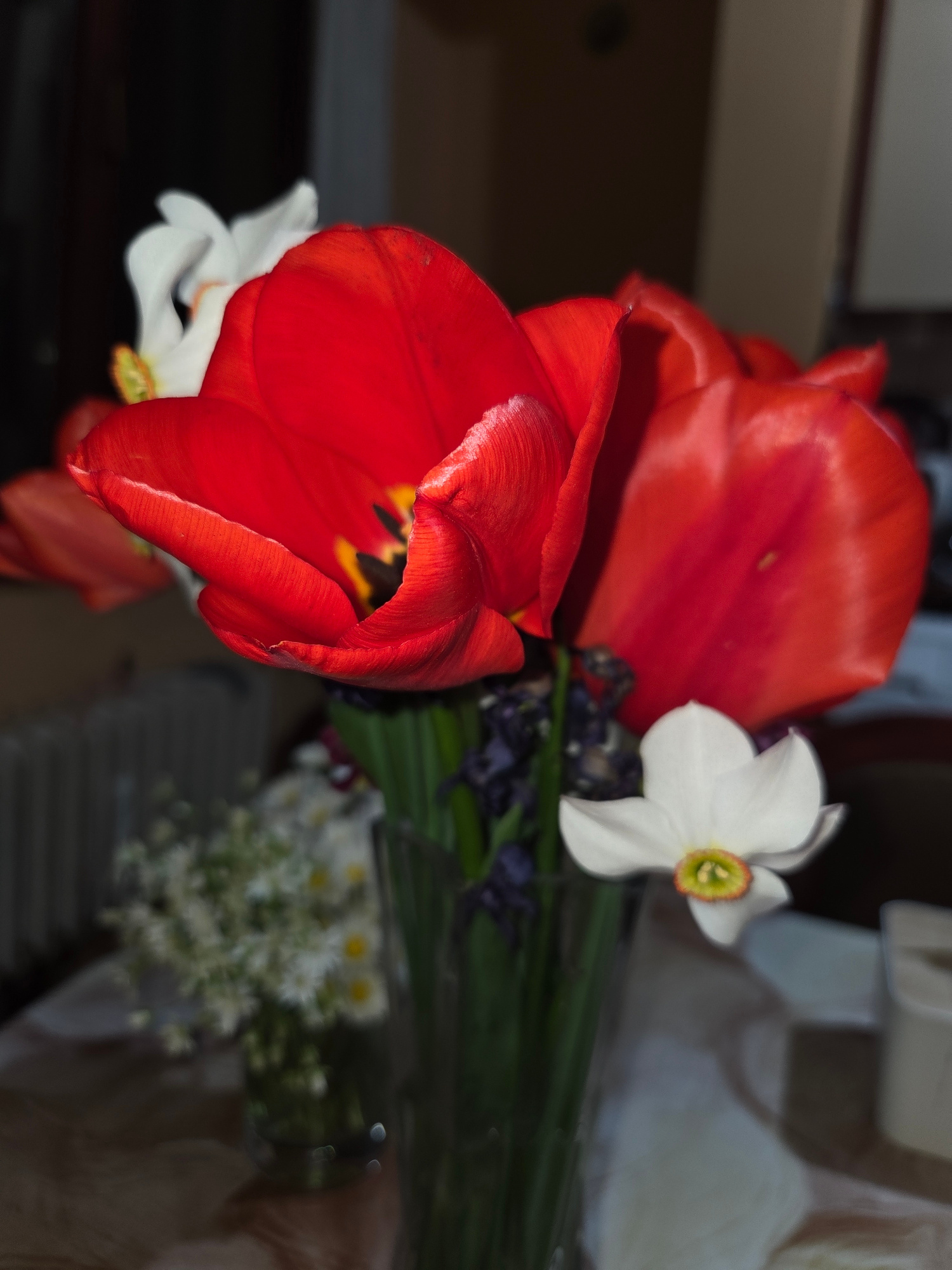 A close-up photograph displays a bouquet of flowers, featuring prominent red tulips and a white daffodil. The composition includes smaller white flowers with yellow centers, and what appears to be pur…read more