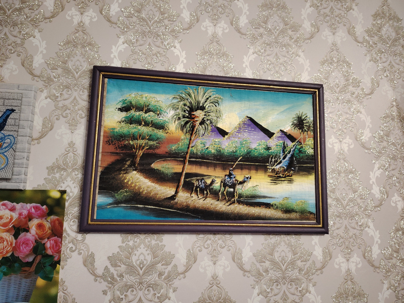 A framed painting hangs on a wallpapered wall. The painting depicts an Egyptian scene with pyramids, palm trees, camels, and a body of water. The frame is dark purple with a thin gold inner border. To…read more