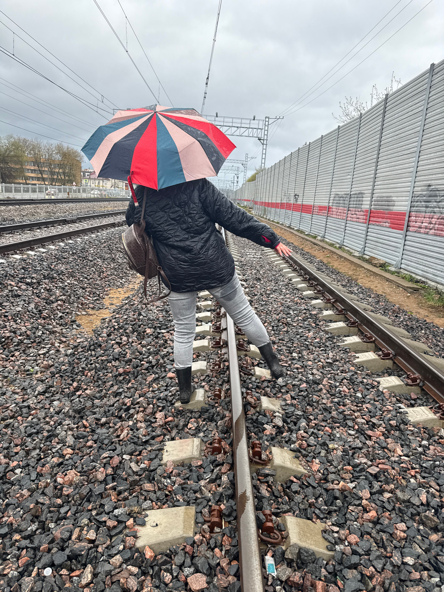 A person stands precariously on a railway track. The individual is equipped with a colorful umbrella, gray trousers, black boots, and a quilted jacket. They extend an arm outward. The location is iden…read more