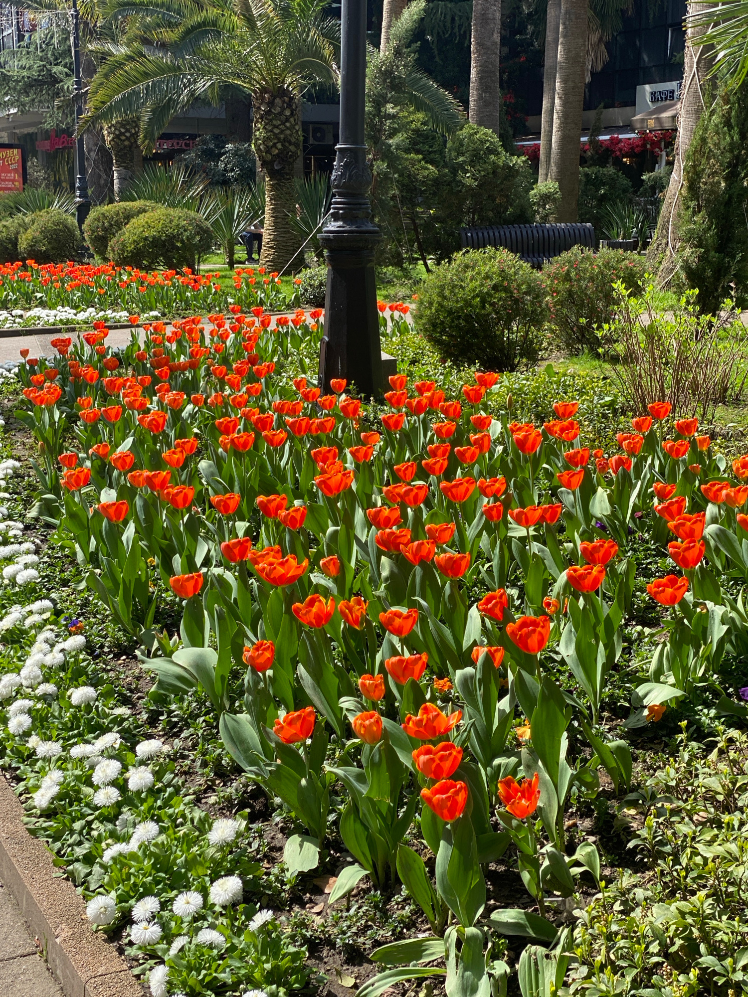 The image captures a vibrant flowerbed in the city of Sochi, Russia. The foreground is dominated by a dense arrangement of orange tulips, their leaves creating a lush green backdrop. Adjacent to the t…read more