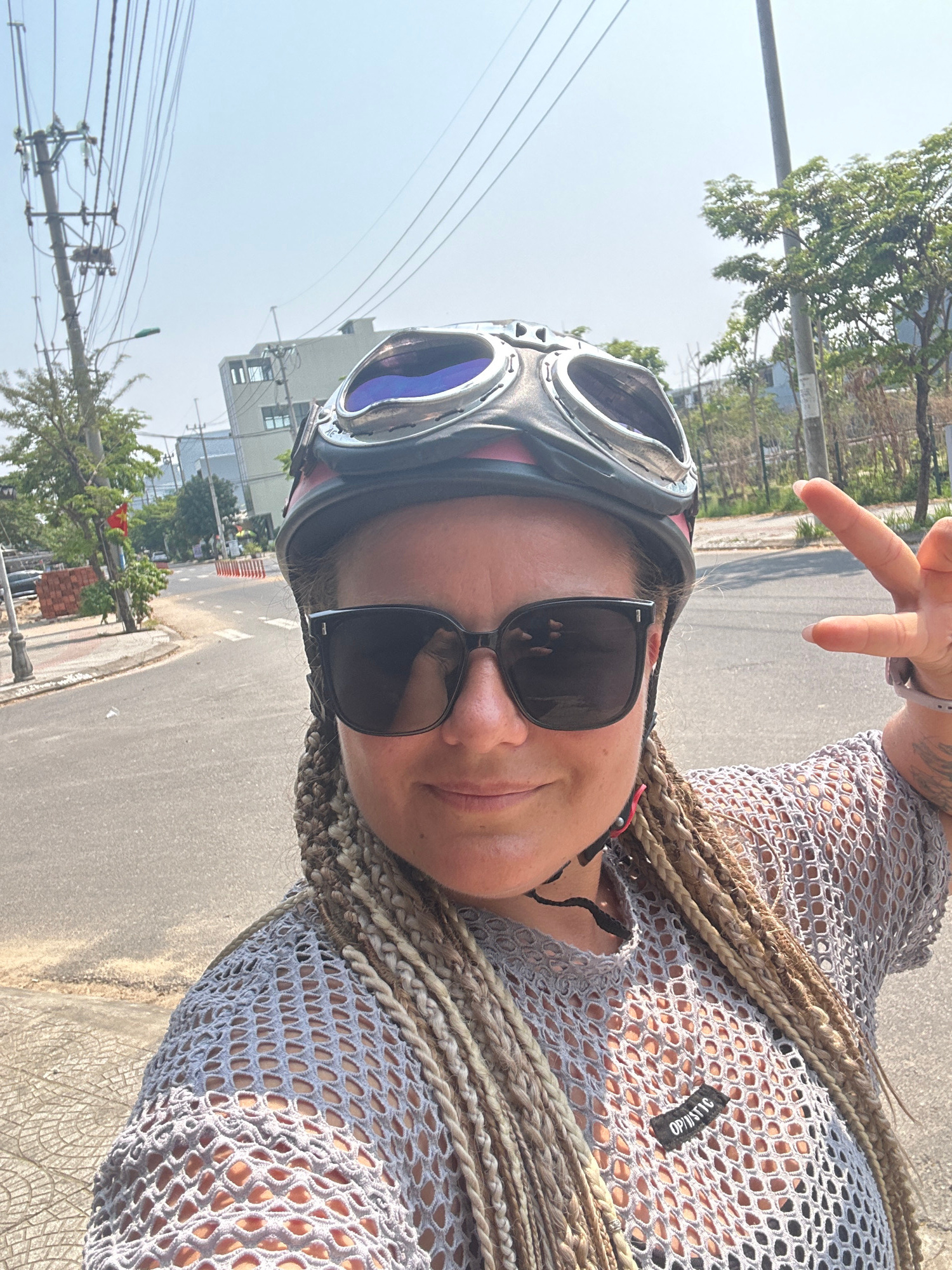 A woman wearing a helmet with goggles and sunglasses poses for a selfie while standing on a paved road. She is wearing a light gray, netted top and has blonde braids. Her left hand is raised, fingers…read more