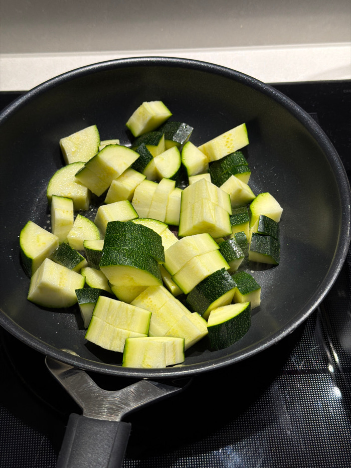 The image displays a close-up, overhead view of a black frying pan containing numerous diced zucchini pieces. The zucchini pieces vary slightly in size but are generally uniform, exhibiting dark green…read more