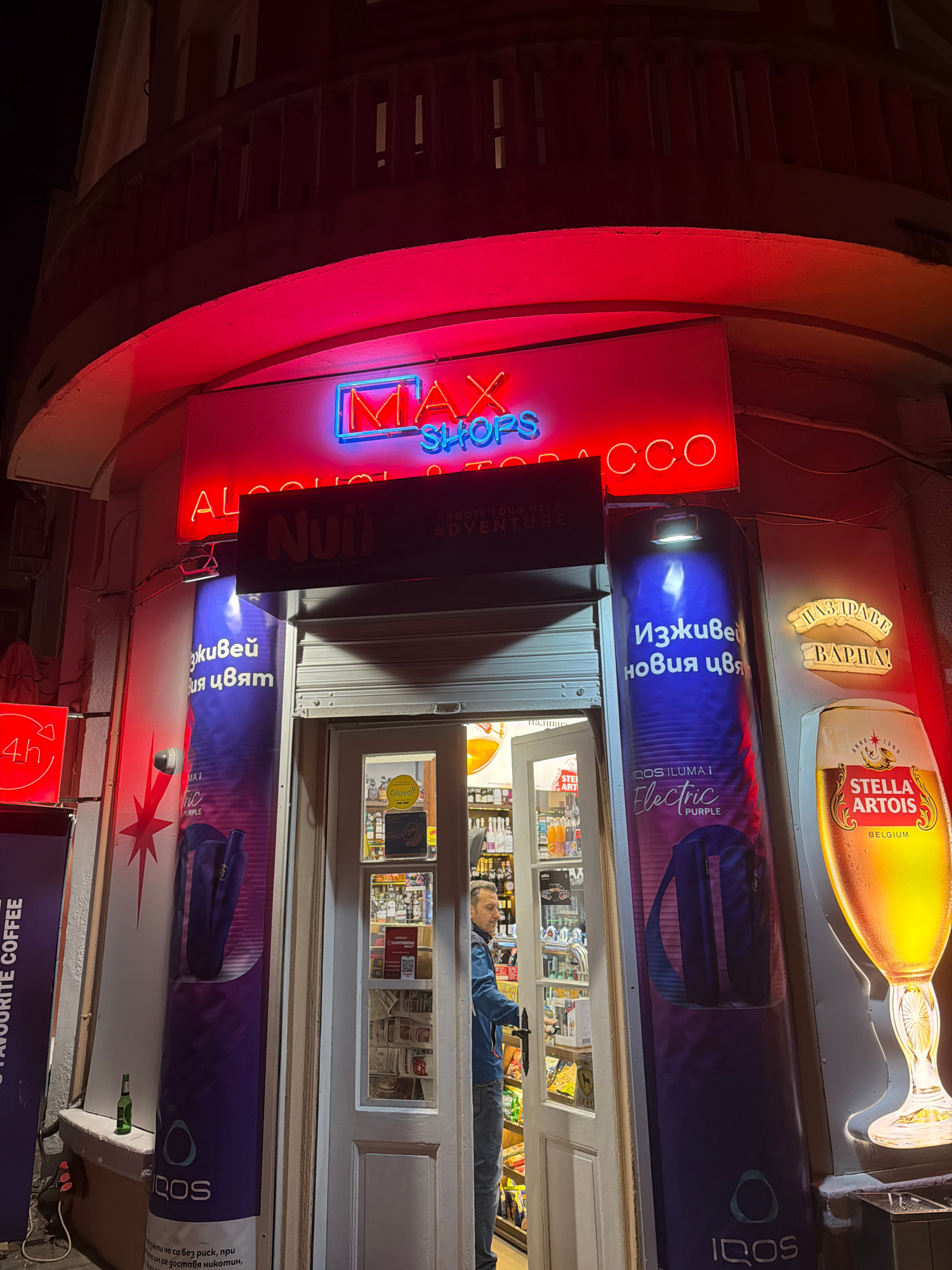 The image shows the exterior of a shop in Varna, Bulgaria, at night. The shop is identifiable by its neon signs that read "MAX SHOPS ALCO TOCCO Nui", as well as advertisements for Stella Artois beer a…read more