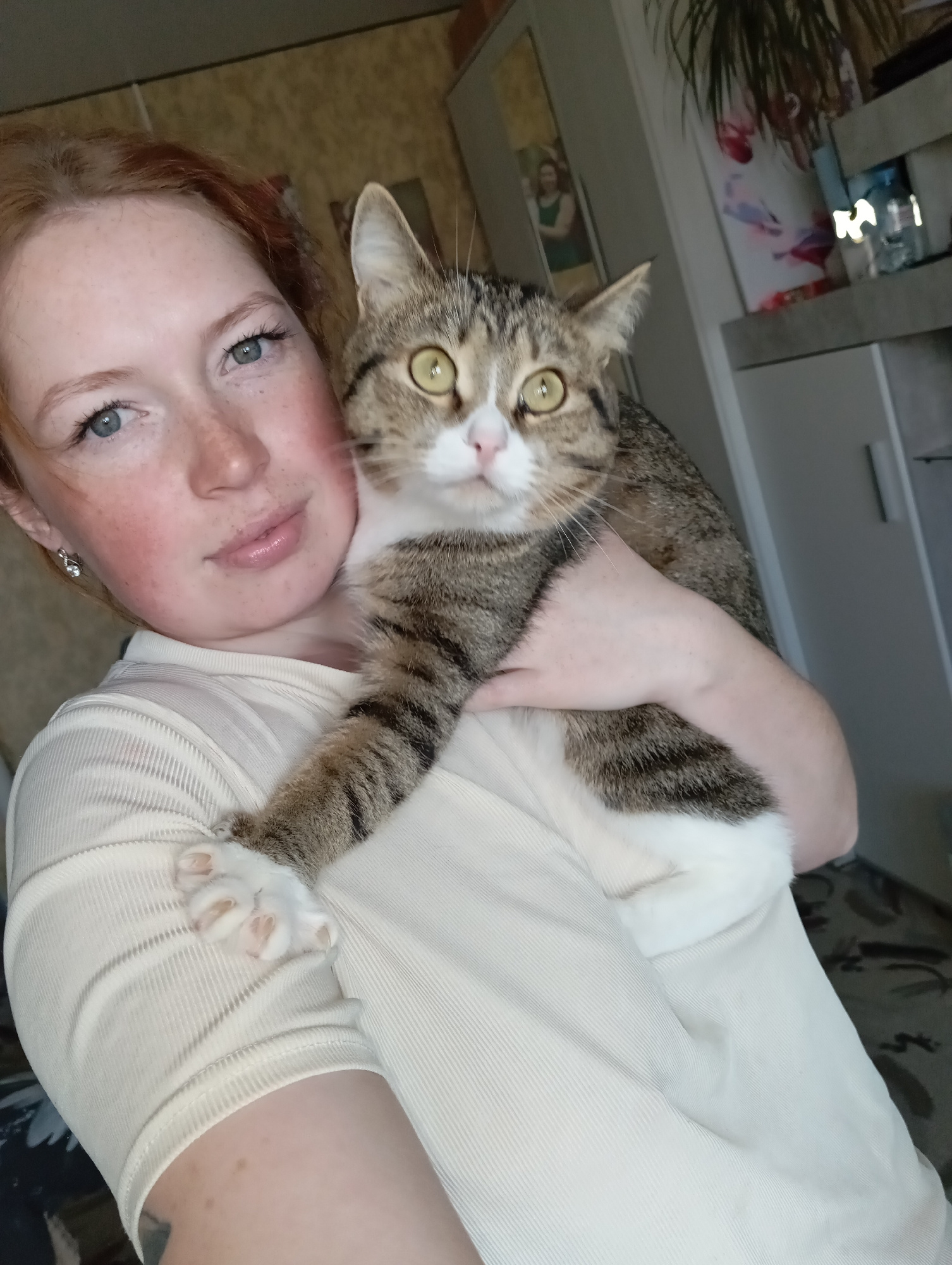A person is holding a cat. The person has fair skin, freckles, and blue eyes. The cat is brown and white tabby. They are in an indoor environment, possibly a home. The location is unknown.