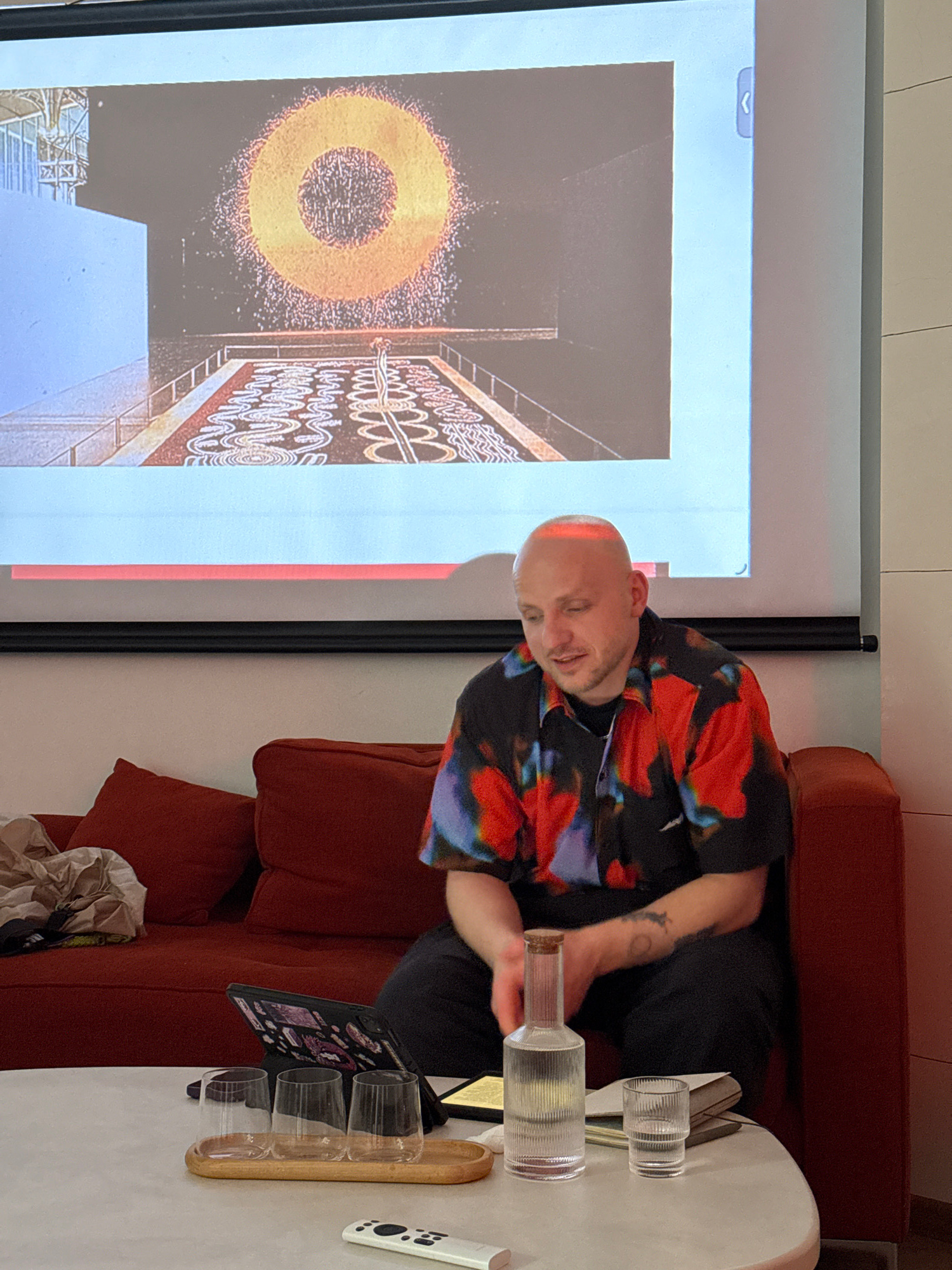 An indoor scene depicts a man sitting on a reddish-brown sofa, facing a large projection screen that displays abstract art. The man is bald with a short beard, wearing a vibrant, patterned shirt in bl…read more