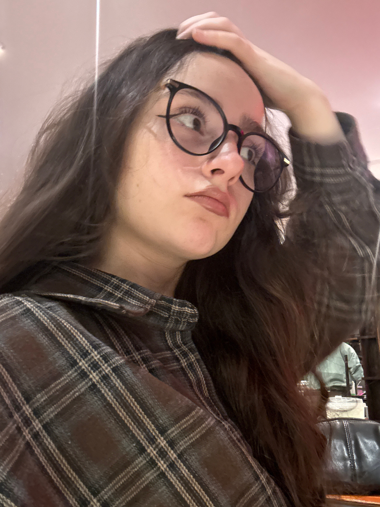 A young female subject is depicted in a close-up, angled shot, occupying the majority of the frame from the chest up. She has long, dark brown hair. She wears round, black-framed eyeglasses with a gol…read more