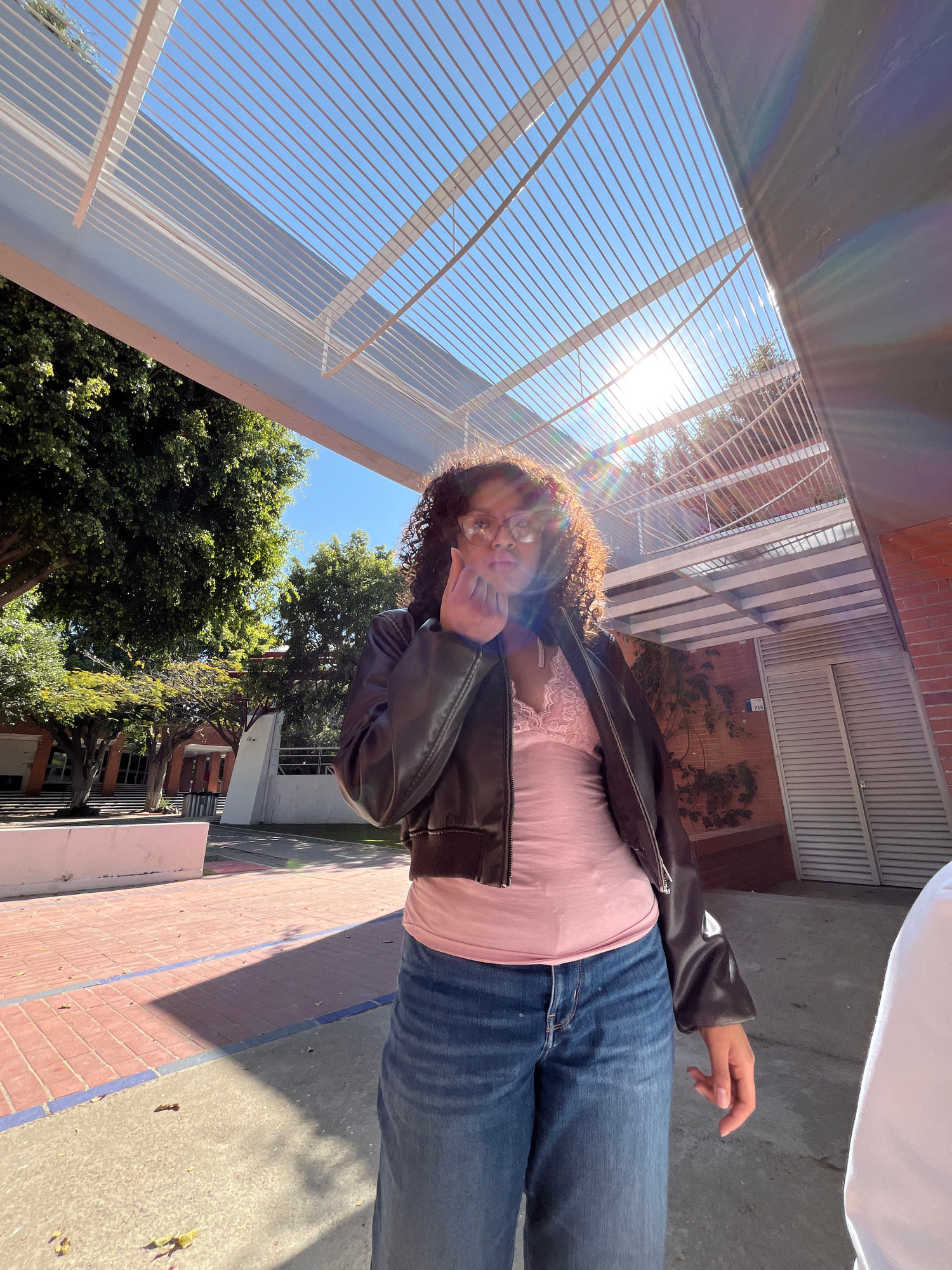 An outdoor scene depicts a young woman standing centrally under a large, light-colored metal pergola structure with numerous parallel horizontal bars. She has curly dark hair, wears glasses, a dark br…read more