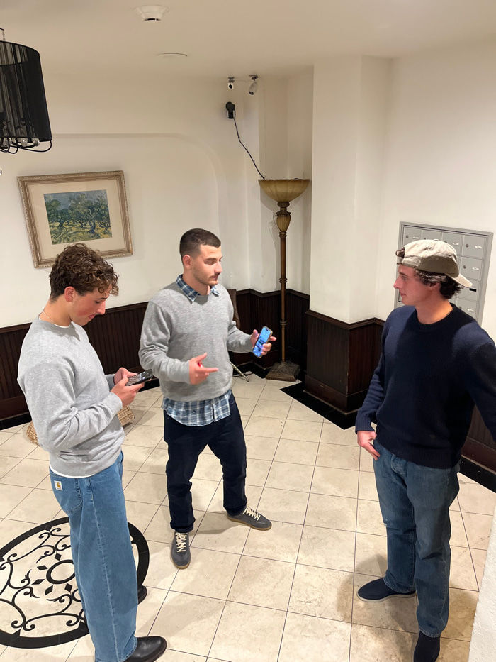 Three young men stand in the tiled lobby of a building. One, wearing a blue sweater and baseball cap, stands near the mailboxes. Another, in a gray sweater, holds a blue phone and gestures. The third,…read more