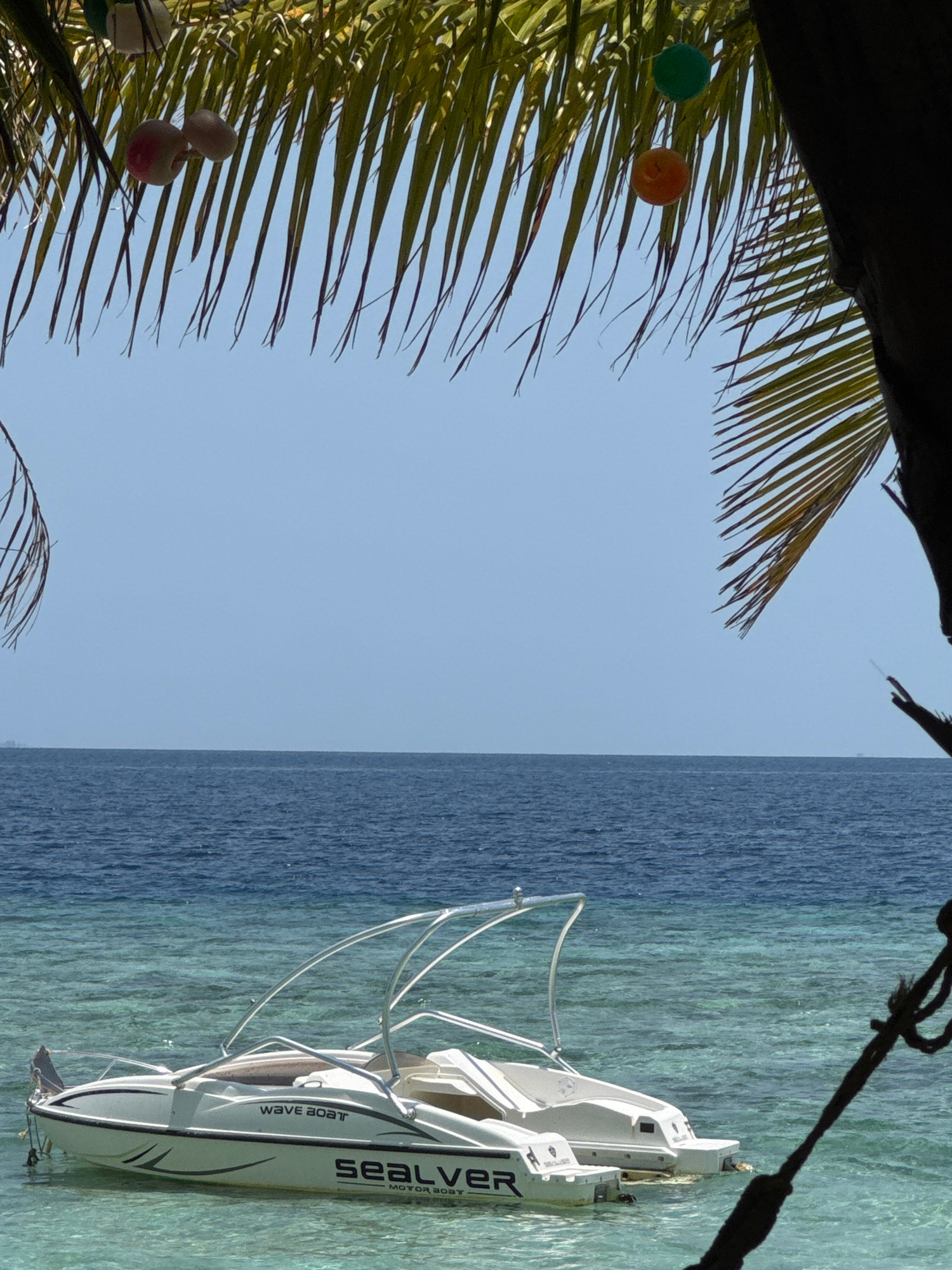 The image captures a scene in Ukulhas, Maldives. A white "Sealver Wave Boat" with a silver frame floats on turquoise and dark blue water. The sky is clear and blue. A palm tree overhangs the scene fro…read more