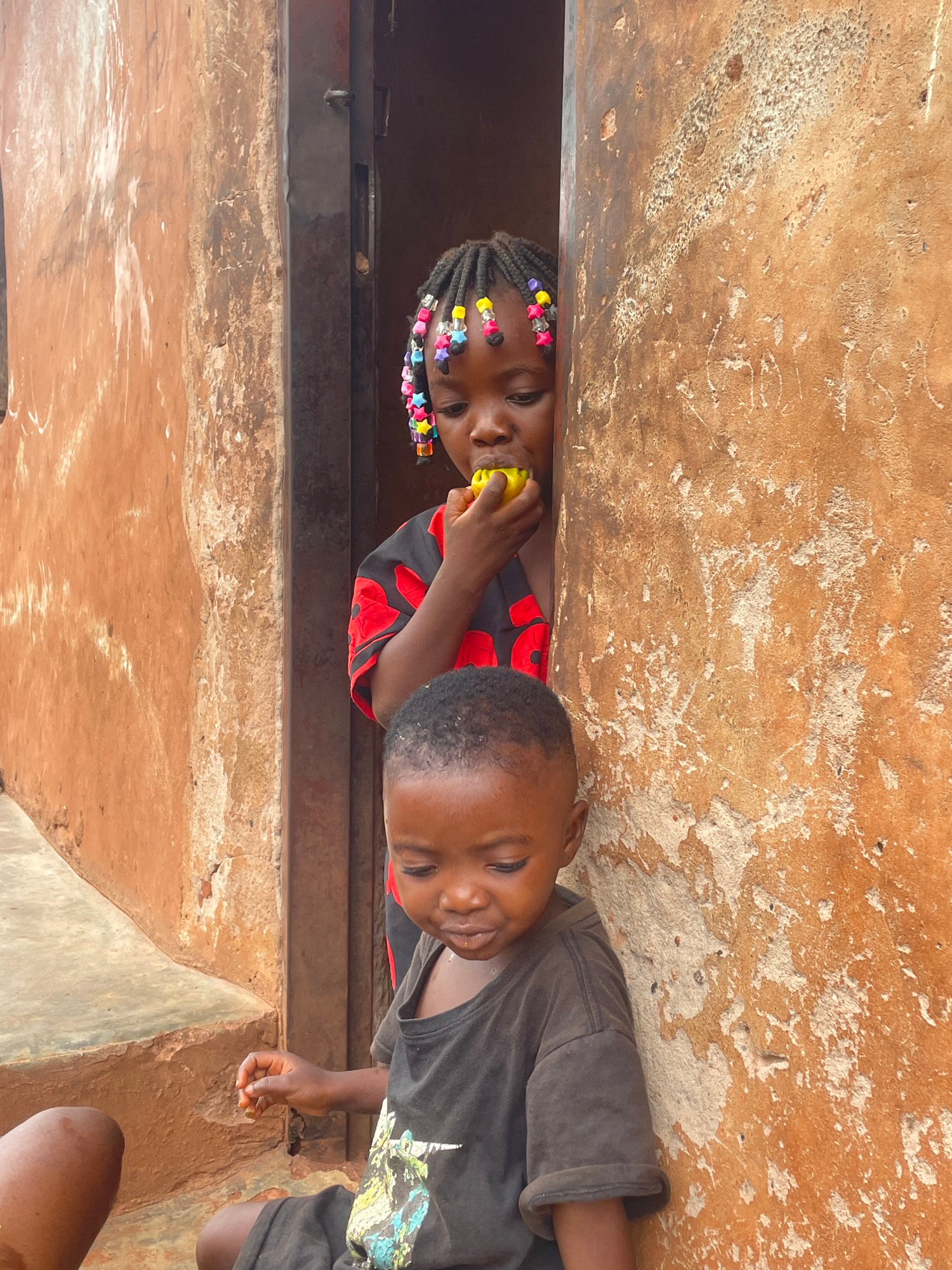 Two children, a girl and a boy, are positioned against a wall in what appears to be Ogbe, Nigeria. The girl, on the left, has dark skin, braided hair adorned with colorful beads, and is holding a yell…read more