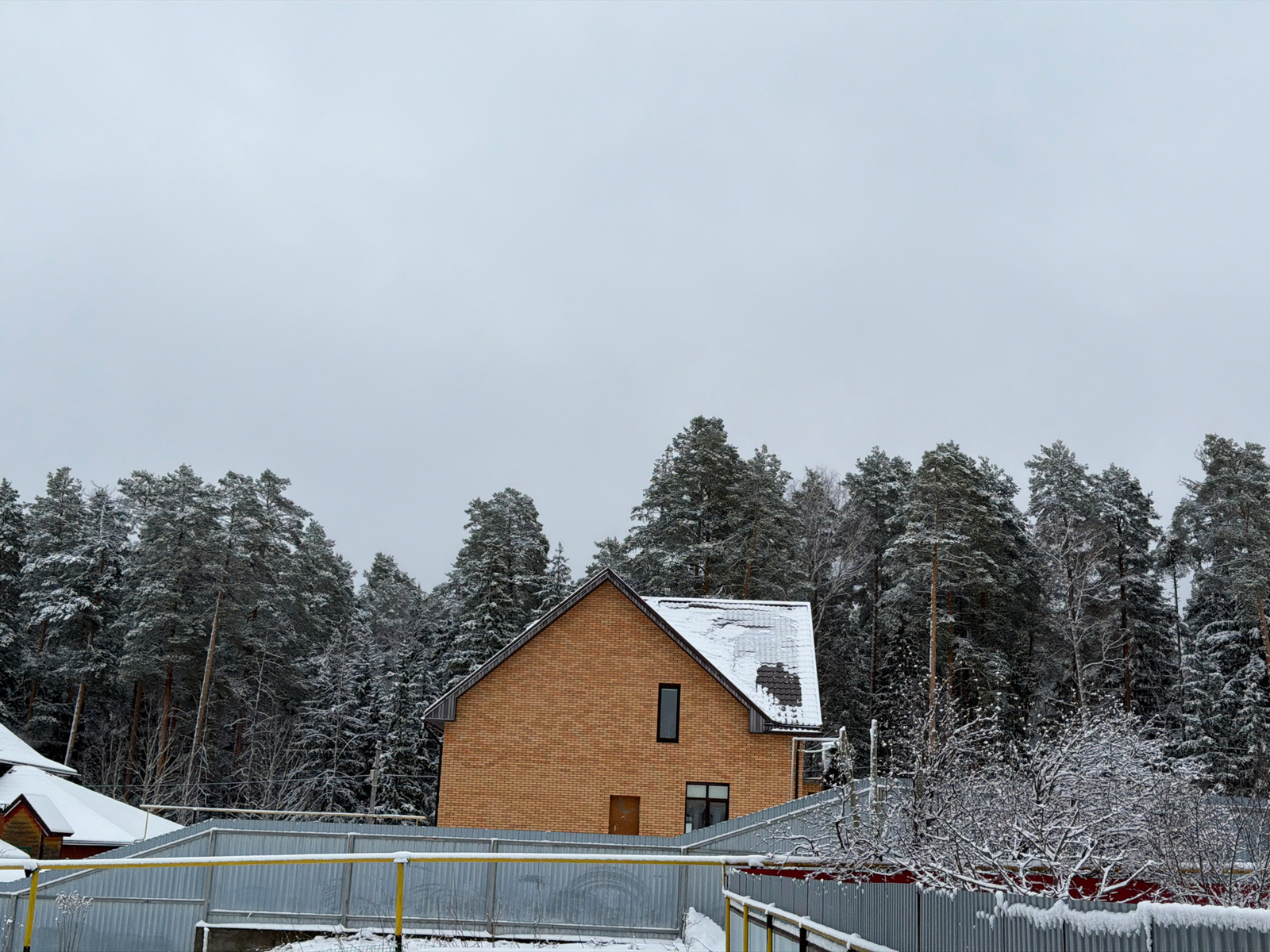 The image depicts a two-story brick house with a dark roof covered in patches of snow, situated in a snowy environment possibly during winter. The house has a small rectangular window on the second fl…read more