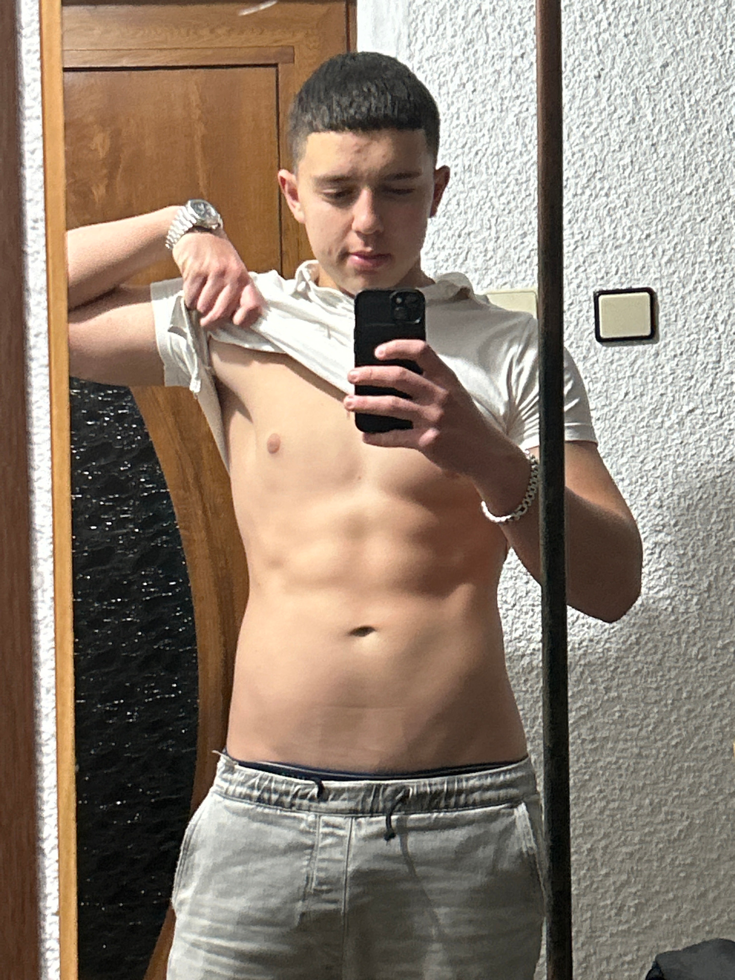 A male, reflected in a mirror, is holding a black smartphone in his right hand and partly lifting the front of his white t-shirt with his left hand. He is wearing light-colored shorts with a dark wais…read more