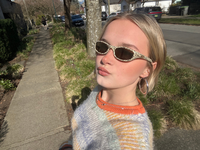 The image depicts a blonde-haired individual, appearing female, posing for a selfie on a residential street in Vancouver, Canada, under bright daylight. The subject occupies the right side of the fram…read more