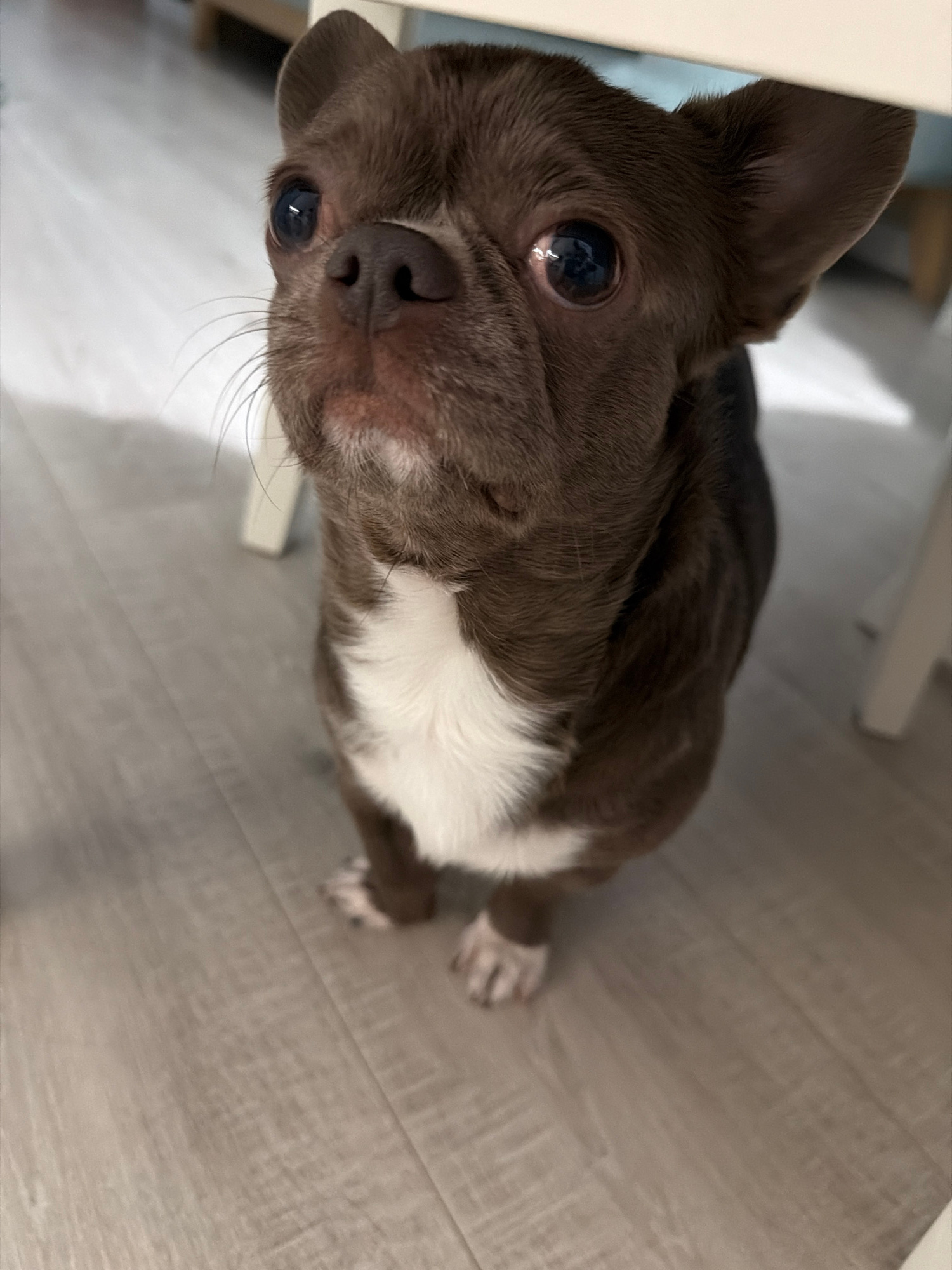 A brown and white Chihuahua is sitting under a table on a light wood-look floor. The dog's head is tilted up towards the camera. The background includes the legs of a light-colored table. The location…read more