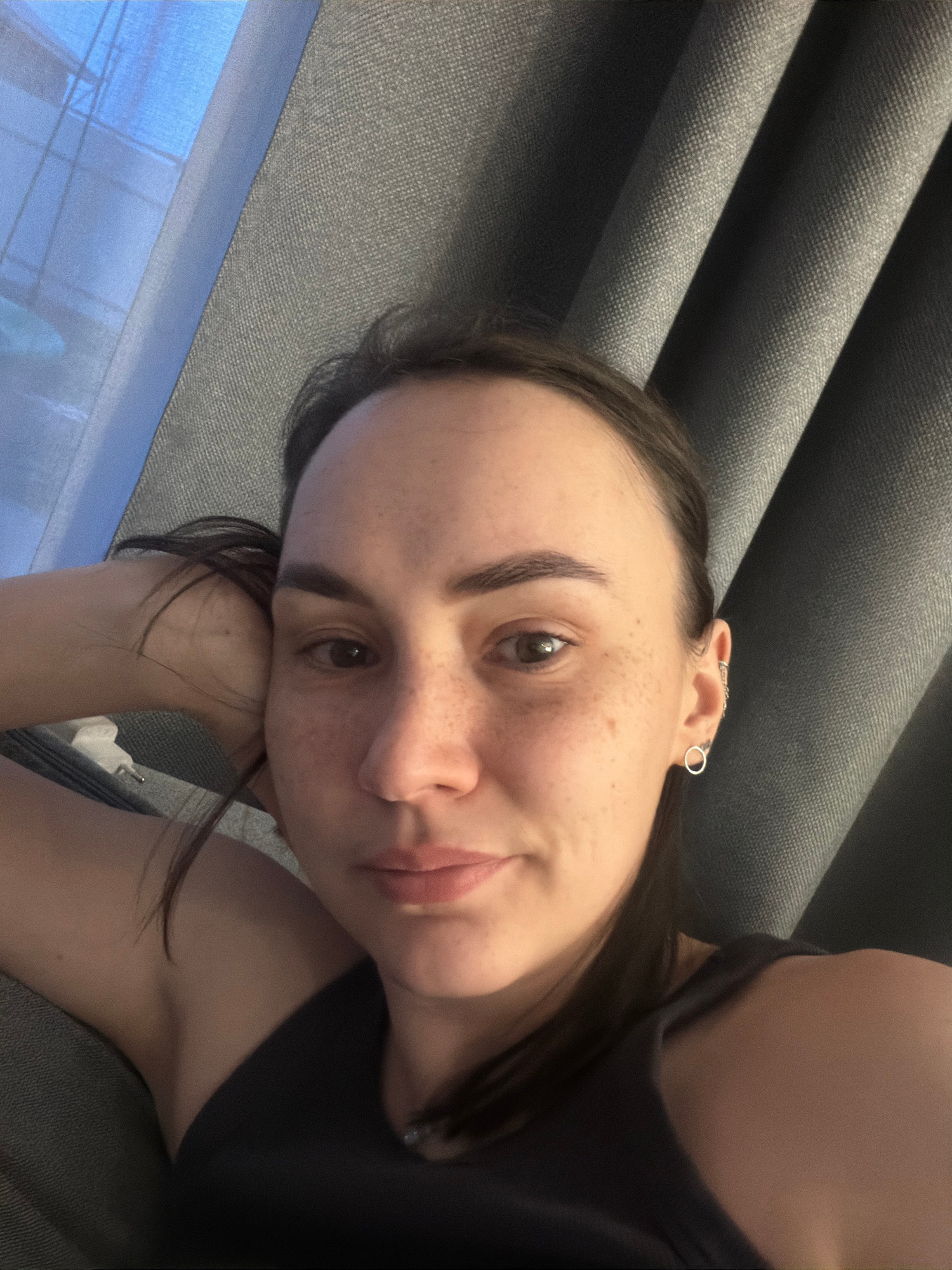 A medium shot captures a woman lying down. She has dark hair, fair skin with freckles, and is wearing earrings. She is resting her head on her hand, which is visible in the lower-left corner. She is w…read more