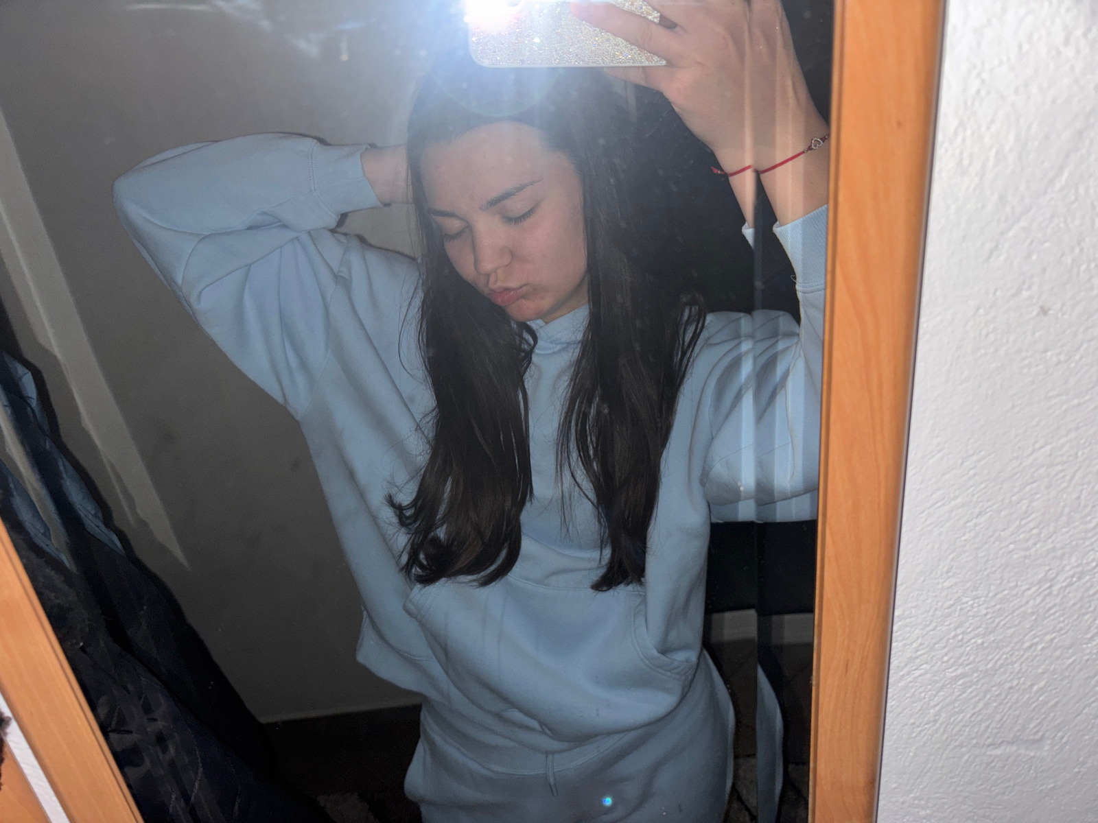 A young woman with dark hair and wearing a light blue hooded sweatshirt and matching pants is taking a selfie in a mirror. She is facing the mirror, with her head tilted to the side and her lips sligh…read more