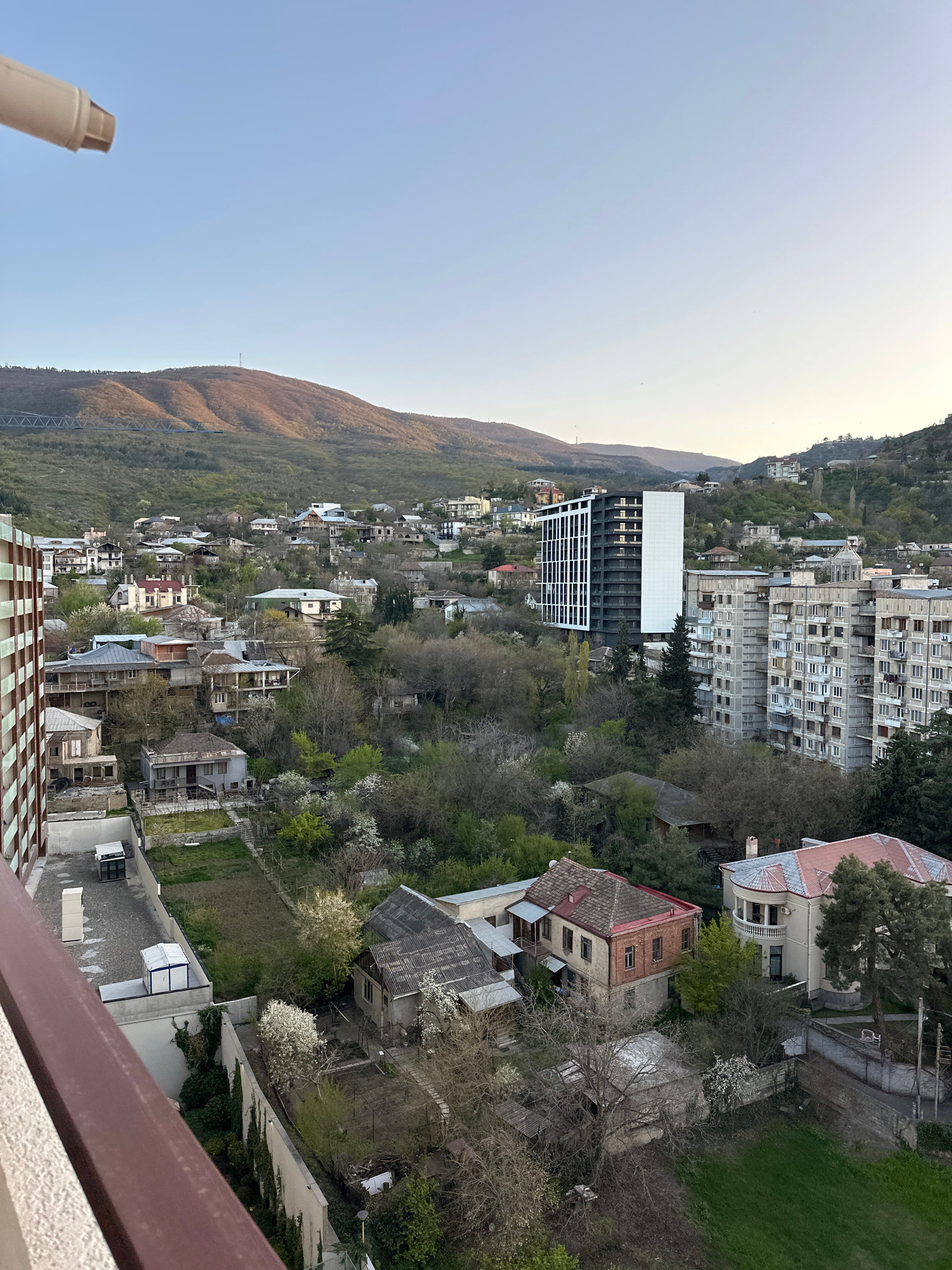 The image shows a hillside neighborhood in Tbilisi, Georgia. The houses are interspersed with trees and vegetation. A mountain rises in the background. Several tall buildings are visible in the distan…read more