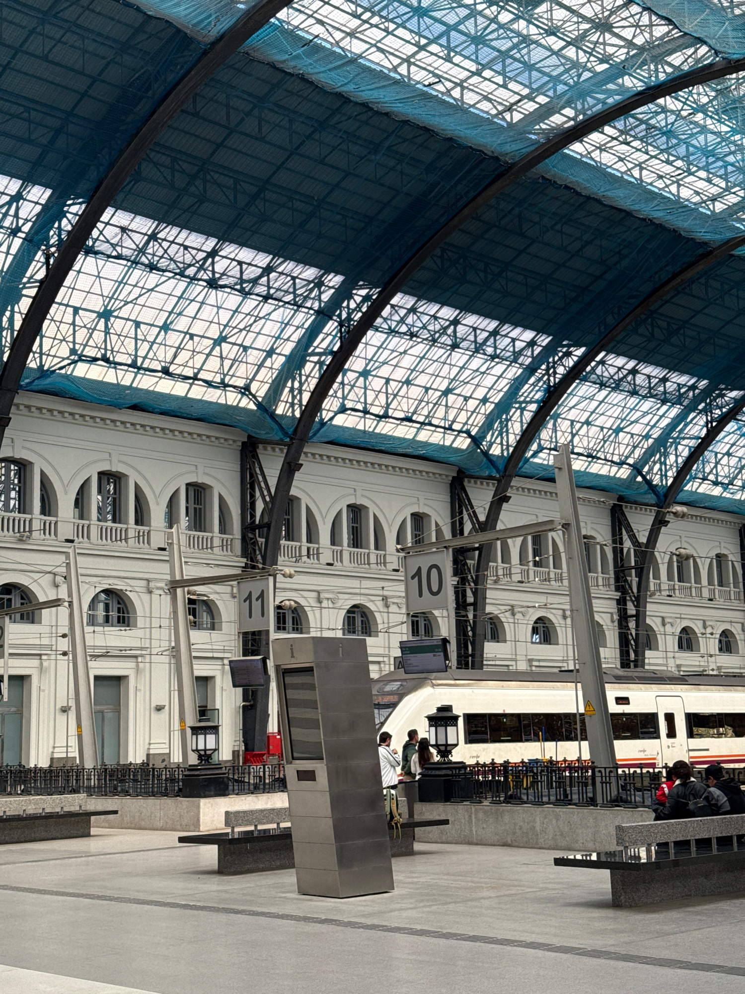 The image depicts the interior of a train station in Barcelona, Spain. The station features a high, arched glass and steel roof, with a blue safety net. The building's facade along the track is white…read more