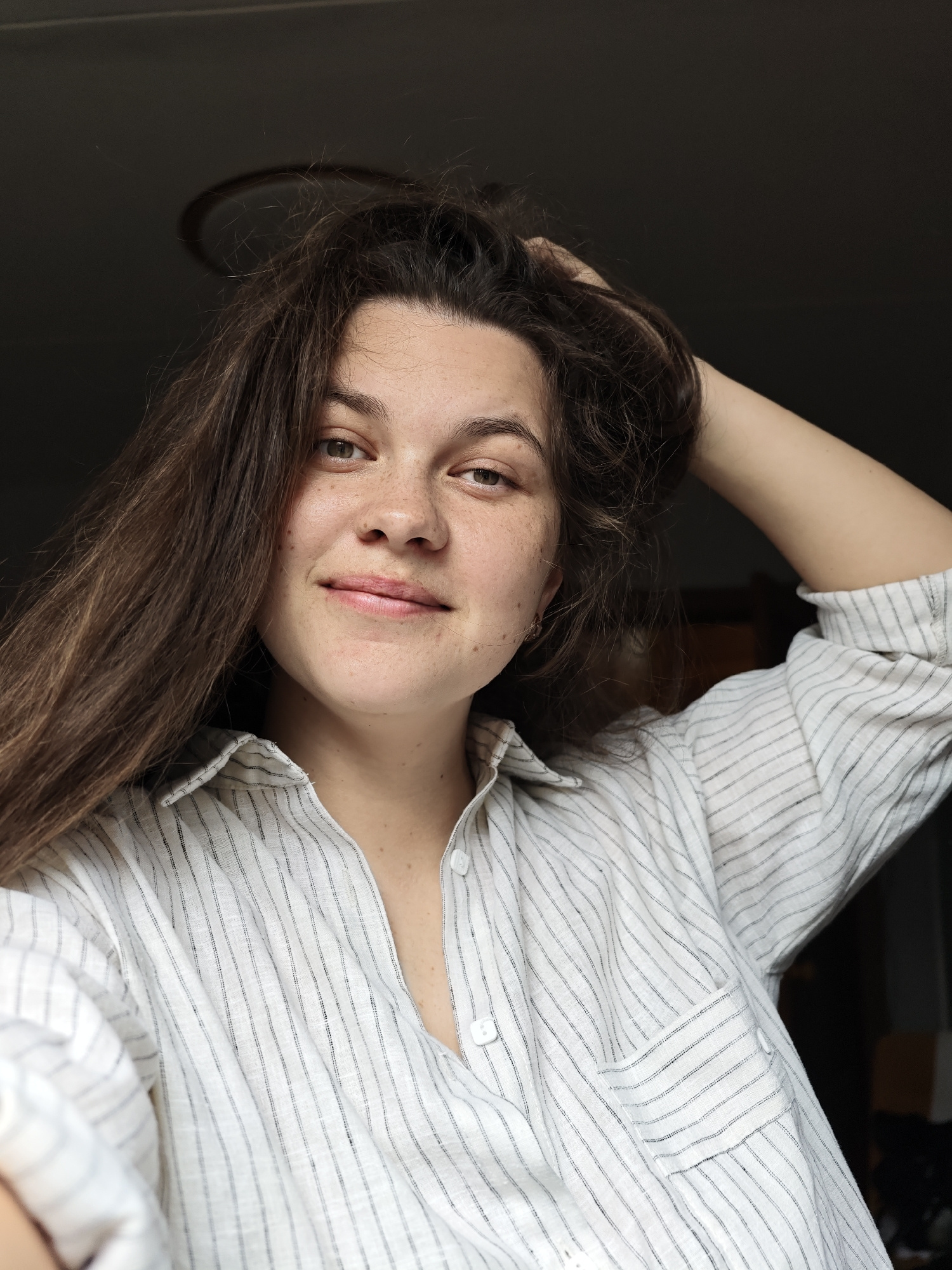 A young woman with light skin, brown hair, and freckles is posing for a selfie indoors. She is wearing a white and gray striped button-down shirt. Her right arm is raised, with her hand partially in h…read more