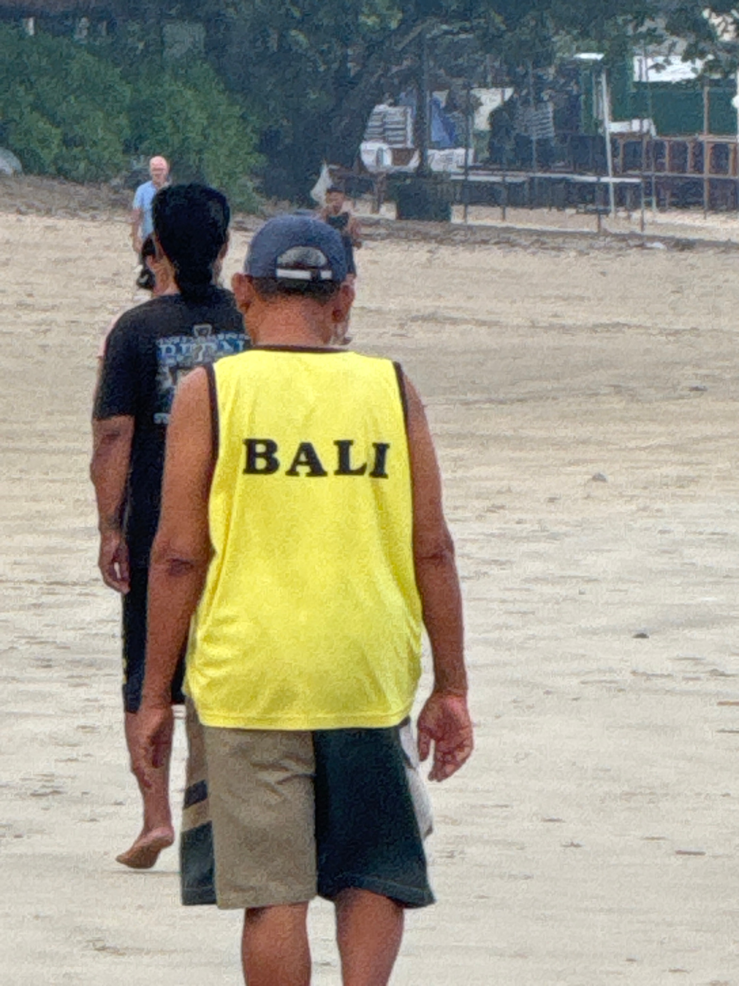 On a sandy beach in Jimbaran, Indonesia, a man in a yellow "BALI" tank top and dark shorts stands barefoot. Another person in a dark shirt stands nearby, also barefoot. In the background, trees and bu…read more