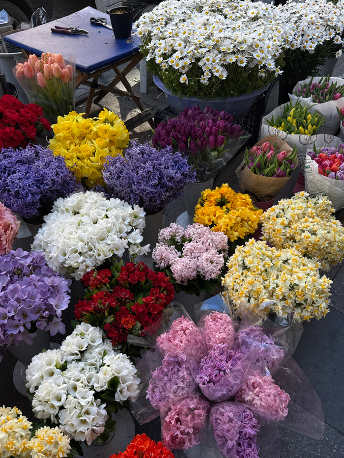 The image depicts a vibrant outdoor flower stall located in Şişli, Turkey. Numerous bouquets and potted flowers are arranged for display. Dominating the upper right quadrant is a large blue pot overfl…read more