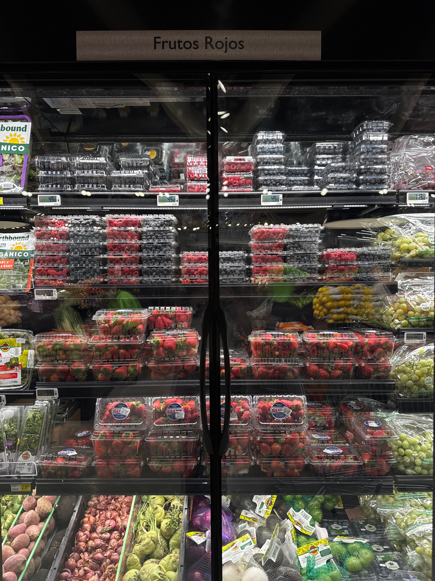 The image shows a refrigerated display case at a grocery store in Puebla, Mexico. The sign on the left indicates "Frutos Rojos" (Red Fruits), which is supported by the produce inside the case. Package…read more
