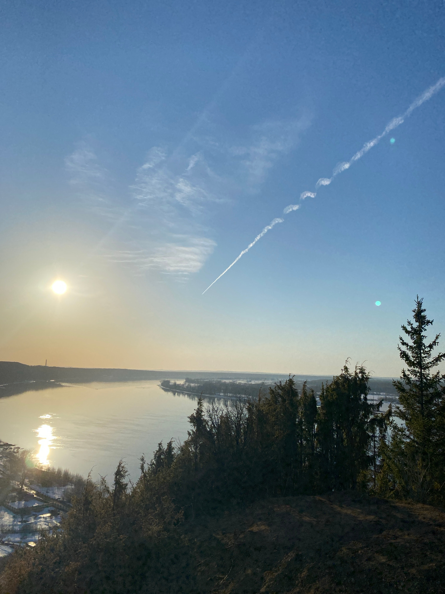 The image shows a landscape view in Ольховка, Russia on a sunny day. A river reflects the bright sun, and the opposite bank is visible in the distance. A line of trees and vegetation lines the top-right of the frame. In the sky, a contrail extends diagonally across the blue sky, partly dissipated. | Open Wire