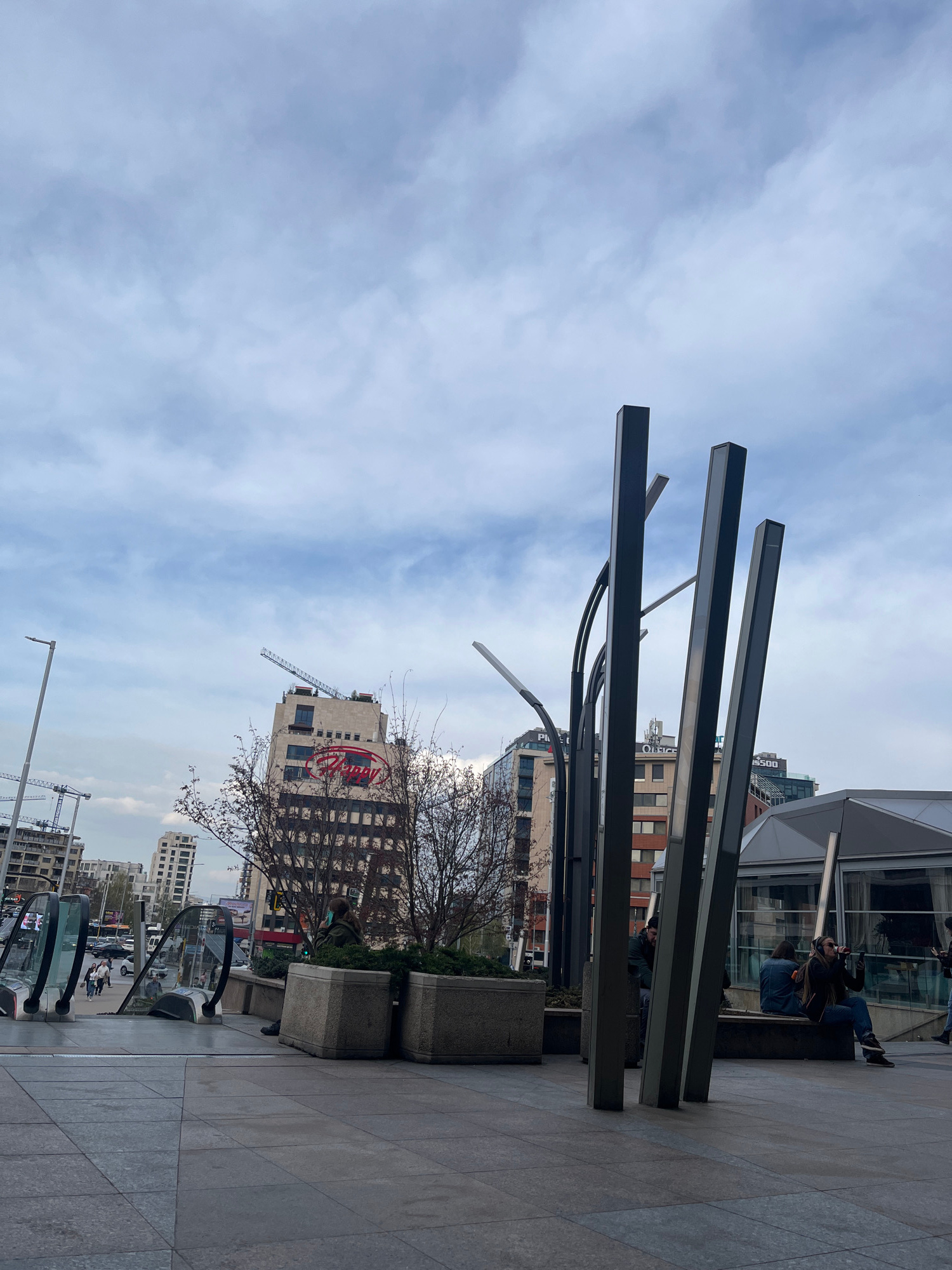 This image captures an urban plaza scene in Sofia, Bulgaria, characterized by modern architecture and everyday city life under a partially cloudy sky. The perspective suggests a view from a raised pla…read more