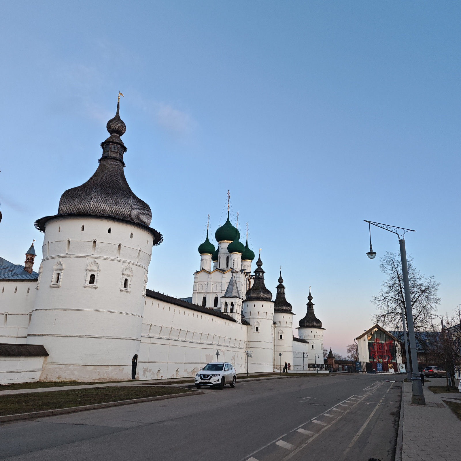 The image depicts a street scene in Rostov, Russia, featuring a section of the Rostov Kremlin. The Kremlin wall and towers are prominent, painted white with dark, distinctive roof structures. A modernβ¦read more