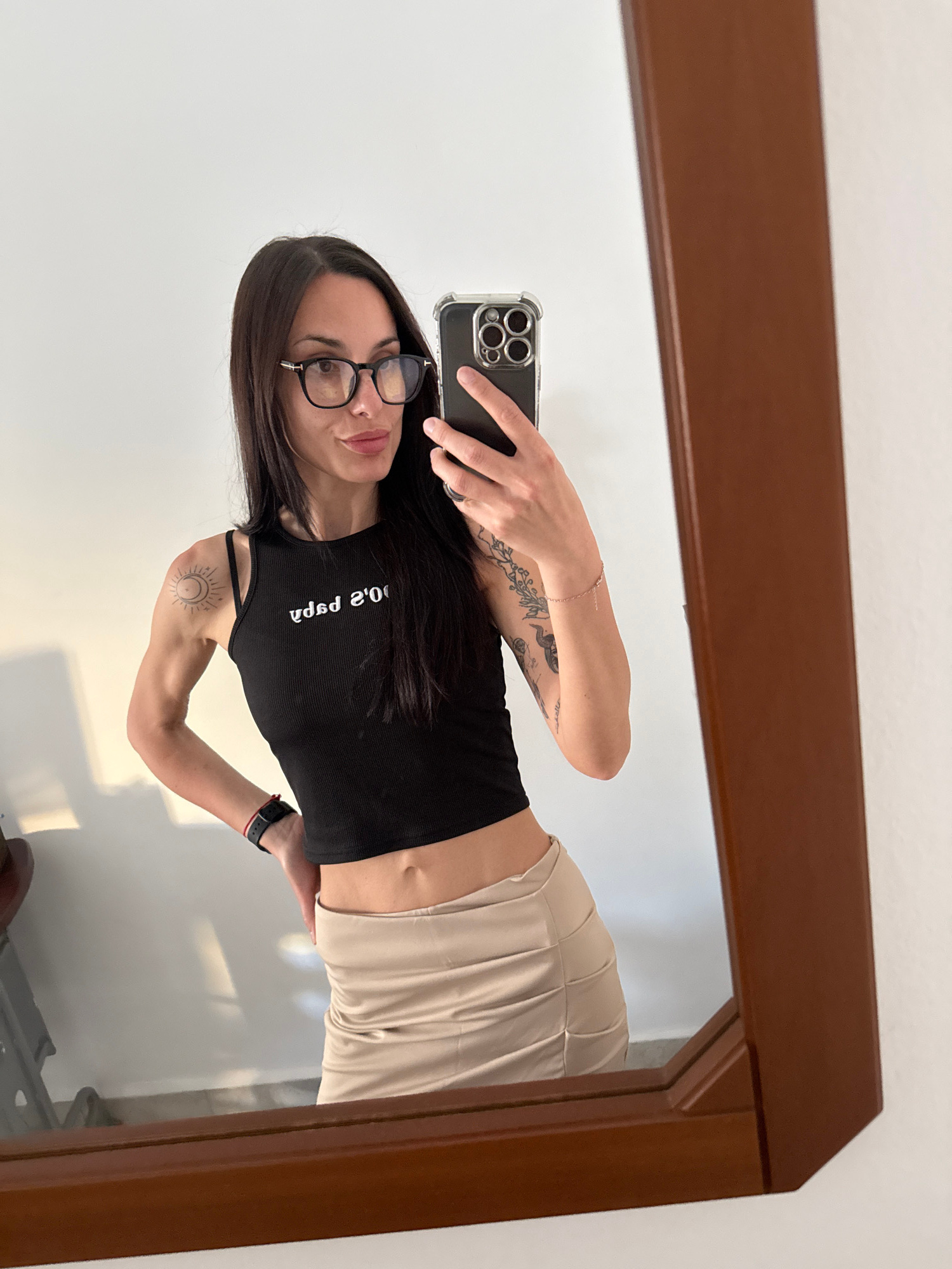 The image is a selfie taken in a mirror. A woman is holding a smartphone in her right hand, taking the picture. She is wearing glasses, a black tank top with white writing, and light-colored pants. Sh…read more