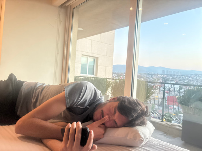 An adult male, wearing a grey short-sleeved t-shirt and dark trousers, lies on his left side on a bed with white bedding. His head rests on a white pillow. His right hand holds a dark smartphone posit…read more